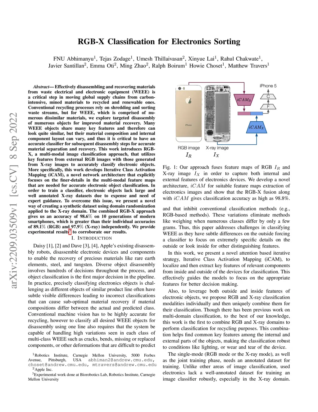 Effectively disassembling and recovering materials from waste electrical and electronic equipment (WEEE) is a critical step in moving global supply chains from carbon-intensive, mined materials to recycled and renewable ones. Conventional recycling processes rely on shredding and sorting waste streams, but for WEEE, which is comprised of numerous dissimilar materials, we explore targeted disassembly of numerous objects for improved material recovery. Many WEEE objects share many key features and therefore can look quite similar, but their material composition and internal component layout can vary, and thus it is critical to have an accurate classifier for subsequent disassembly steps for accurate material separation and recovery. This work introduces RGB-X, a multi-modal image classification approach, that utilizes key features from external RGB images with those generated from X-ray images to accurately classify electronic objects. More specifically, this work develops Iterative Class Activation Mapping (iCAM), a novel network architecture that explicitly focuses on the finer-details in the multi-modal feature maps that are needed for accurate electronic object classification. In order to train a classifier, electronic objects lack large and well annotated X-ray datasets due to expense and need of expert guidance. To overcome this issue, we present a novel way of creating a synthetic dataset using domain randomization applied to the X-ray domain. The combined RGB-X approach gives us an accuracy of 98.6% on 10 generations of modern smartphones, which is greater than their individual accuracies of 89.1% (RGB) and 97.9% (X-ray) independently. We provide experimental results3 to corroborate our results.