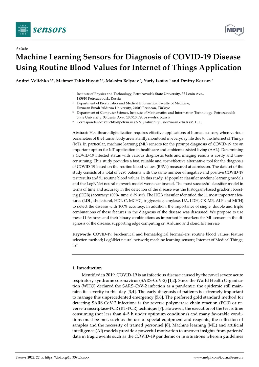 Healthcare digitalization requires effective applications of human sensors, when various parameters of the human body are instantly monitored in everyday life due to the Internet of Things (IoT). In particular, machine learning (ML) sensors for the prompt diagnosis of COVID-19 are an important option for IoT application in healthcare and ambient assisted living (AAL). Determining a COVID-19 infected status with various diagnostic tests and imaging results is costly and time-consuming. This study provides a fast, reliable and cost-effective alternative tool for the diagnosis of COVID-19 based on the routine blood values (RBVs) measured at admission. The dataset of the study consists of a total of 5296 patients with the same number of negative and positive COVID-19 test results and 51 routine blood values. In this study, 13 popular classifier machine learning models and the LogNNet neural network model were exanimated. The most successful classifier model in terms of time and accuracy in the detection of the disease was the histogram-based gradient boosting (HGB) (accuracy: 100%, time: 6.39 sec). The HGB classifier identified the 11 most important features (LDL, cholesterol, HDL-C, MCHC, triglyceride, amylase, UA, LDH, CK-MB, ALP and MCH) to detect the disease with 100% accuracy. In addition, the importance of single, double and triple combinations of these features in the diagnosis of the disease was discussed. We propose to use these 11 features and their binary combinations as important biomarkers for ML sensors in the diagnosis of the disease, supporting edge computing on Arduino and cloud IoT service.
