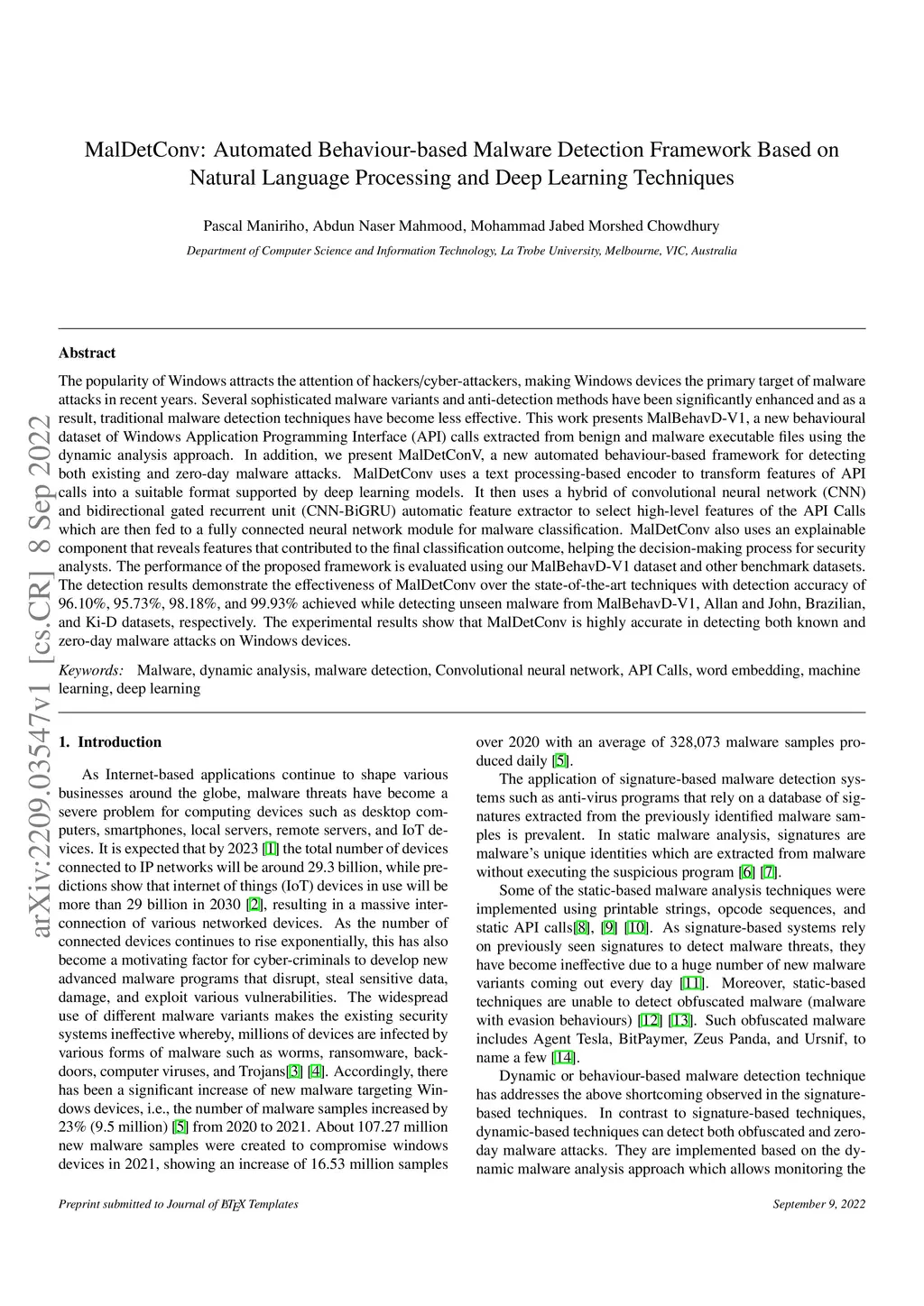 MalDetConv: Automated Behaviour-based Malware Detection Framework Based