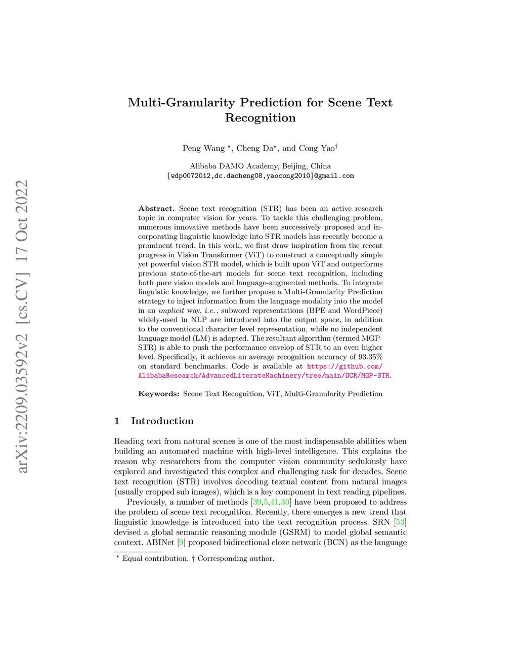 Scene text recognition (STR) has been an active research topic in computer vision for years. To tackle this challenging problem, numerous innovative methods have been successively proposed and incorporating linguistic knowledge into STR models has recently become a prominent trend. In this work, we first draw inspiration from the recent progress in Vision Transformer (ViT) to construct a conceptually simple yet powerful vision STR model, which is built upon ViT and outperforms previous state-of-the-art models for scene text recognition, including both pure vision models and language-augmented methods. To integrate linguistic knowledge, we further propose a Multi-Granularity Prediction strategy to inject information from the language modality into the model in an implicit way, i.e. , subword representations (BPE and WordPiece) widely-used in NLP are introduced into the output space, in addition to the conventional character level representation, while no independent language model (LM) is adopted. The resultant algorithm (termed MGP-STR) is able to push the performance envelop of STR to an even higher level. Specifically, it achieves an average recognition accuracy of 93.35% on standard benchmarks. Code is available at https://github.com/AlibabaResearch/AdvancedLiterateMachinery/tree/main/OCR/MGP-STR.