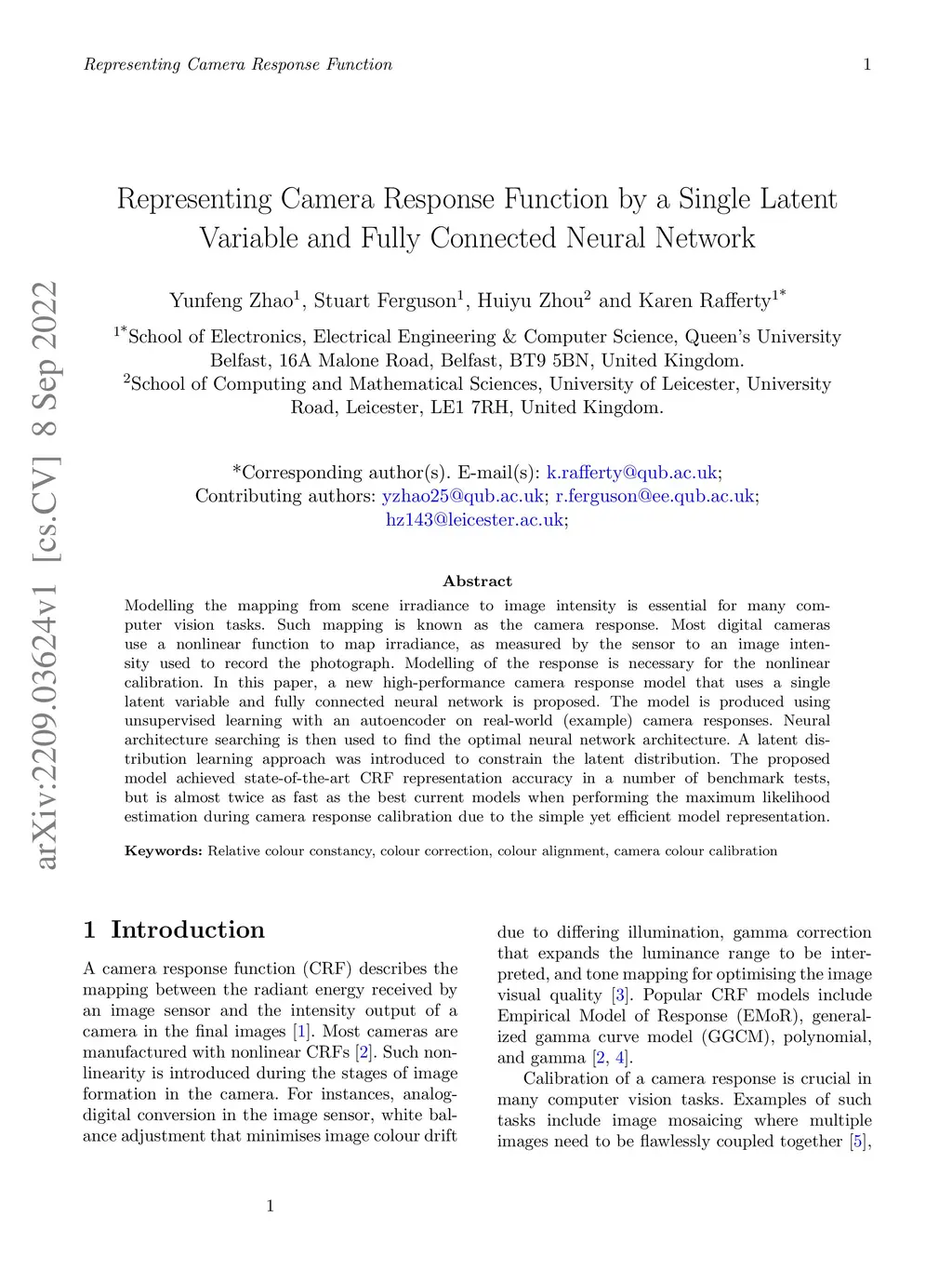 Modelling the mapping from scene irradiance to image intensity is essential for many computer vision tasks. Such mapping is known as the camera response. Most digital cameras use a nonlinear function to map irradiance, as measured by the sensor to an image intensity used to record the photograph. Modelling of the response is necessary for the nonlinear calibration. In this paper, a new high-performance camera response model that uses a single latent variable and fully connected neural network is proposed. The model is produced using unsupervised learning with an autoencoder on real-world (example) camera responses. Neural architecture searching is then used to find the optimal neural network architecture. A latent distribution learning approach was introduced to constrain the latent distribution. The proposed model achieved state-of-the-art CRF representation accuracy in a number of benchmark tests, but is almost twice as fast as the best current models when performing the maximum likelihood estimation during camera response calibration due to the simple yet efficient model representation.
