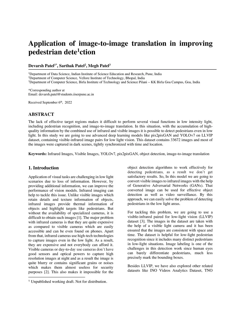 The lack of effective target regions makes it difficult to perform several visual functions in low intensity light, including pedestrian recognition, and image-to-image translation. In this situation, with the accumulation of high-quality information by the combined use of infrared and visible images it is possible to detect pedestrians even in low light. In this study we are going to use advanced deep learning models like pix2pixGAN and YOLOv7 on LLVIP dataset, containing visible-infrared image pairs for low light vision. This dataset contains 33672 images and most of the images were captured in dark scenes, tightly synchronized with time and location.