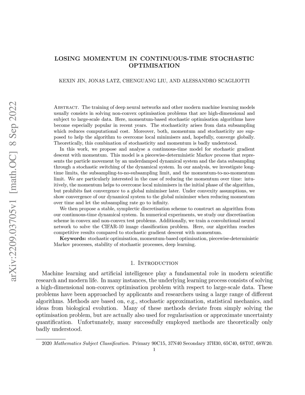 The training of deep neural networks and other modern machine learning models usually consists in solving non-convex optimisation problems that are high-dimensional and subject to large-scale data. Here, momentum-based stochastic optimisation algorithms have become especially popular in recent years. The stochasticity arises from data subsampling which reduces computational cost. Moreover, both, momentum and stochasticity are supposed to help the algorithm to overcome local minimisers and, hopefully, converge globally. Theoretically, this combination of stochasticity and momentum is badly understood. In this work, we propose and analyse a continuous-time model for stochastic gradient descent with momentum. This model is a piecewise-deterministic Markov process that represents the particle movement by an underdamped dynamical system and the data subsampling through a stochastic switching of the dynamical system. In our analysis, we investigate longtime limits, the subsampling-to-no-subsampling limit, and the momentum-to-no-momentum limit. We are particularly interested in the case of reducing the momentum over time: intuitively, the momentum helps to overcome local minimisers in the initial phase of the algorithm, but prohibits fast convergence to a global minimiser later. Under convexity assumptions, we show convergence of our dynamical system to the global minimiser when reducing momentum over time and let the subsampling rate go to infinity. We then propose a stable, symplectic discretisation scheme to construct an algorithm from our continuous-time dynamical system. In numerical experiments, we study our discretisation scheme in convex and non-convex test problems. Additionally, we train a convolutional neural network to solve the CIFAR-10 image classification problem. Here, our algorithm reaches competitive results compared to stochastic gradient descent with momentum.