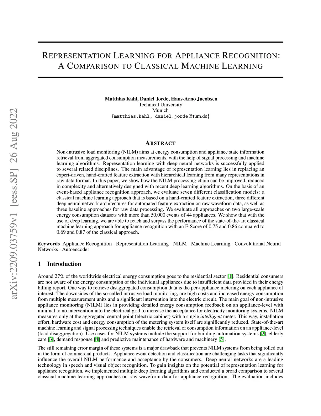 Non-intrusive load monitoring (NILM) aims at energy consumption and appliance state information retrieval from aggregated consumption measurements, with the help of signal processing and machine learning algorithms. Representation learning with deep neural networks is successfully applied to several related disciplines. The main advantage of representation learning lies in replacing an expert-driven, hand-crafted feature extraction with hierarchical learning from many representations in raw data format. In this paper, we show how the NILM processing-chain can be improved, reduced in complexity and alternatively designed with recent deep learning algorithms. On the basis of an event-based appliance recognition approach, we evaluate seven different classification models: a classical machine learning approach that is based on a hand-crafted feature extraction, three different deep neural network architectures for automated feature extraction on raw waveform data, as well as three baseline approaches for raw data processing. We evaluate all approaches on two large-scale energy consumption datasets with more than 50,000 events of 44 appliances. We show that with the use of deep learning, we are able to reach and surpass the performance of the state-of-the-art classical machine learning approach for appliance recognition with an F-Score of 0.75 and 0.86 compared to 0.69 and 0.87 of the classical approach.