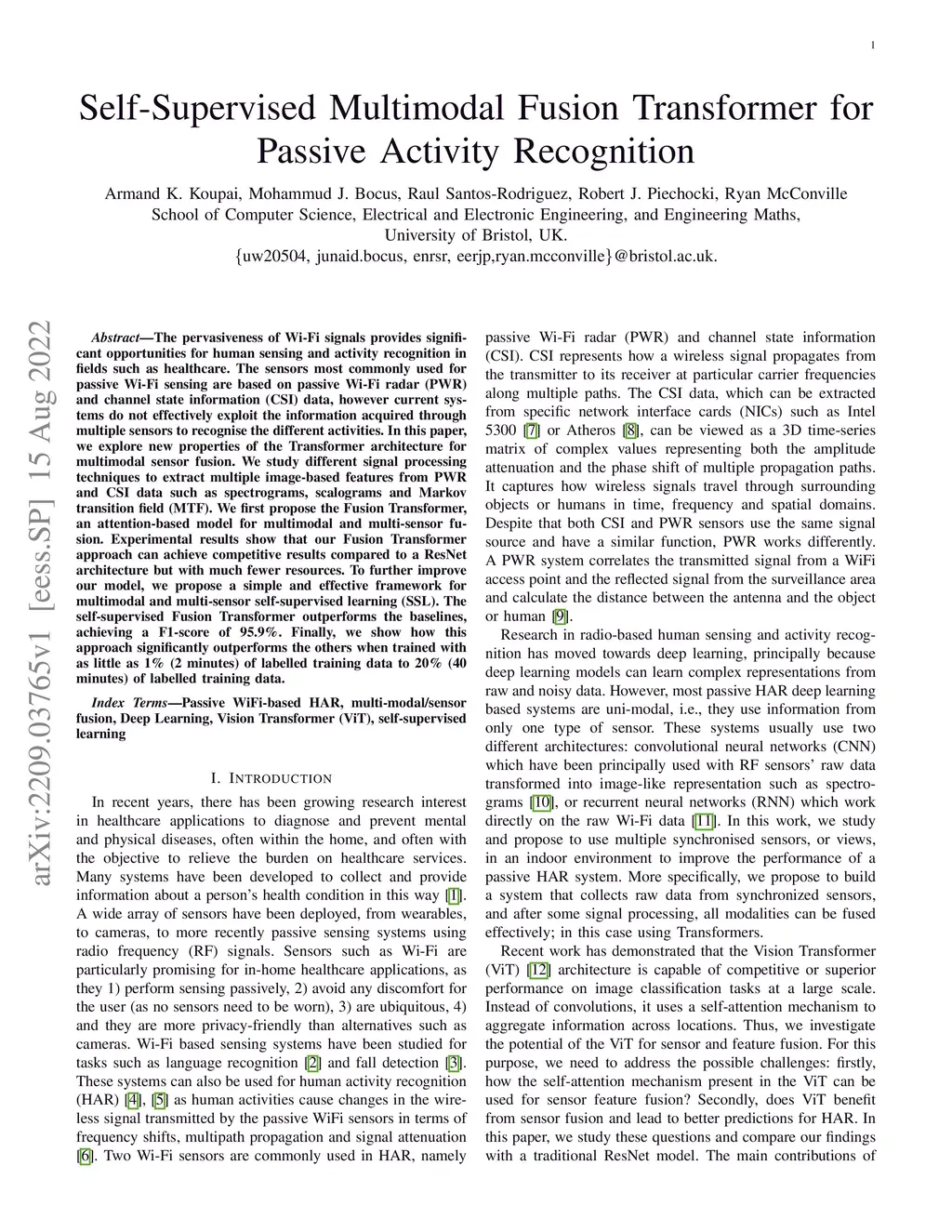 The pervasiveness of Wi-Fi signals provides significant opportunities for human sensing and activity recognition in fields such as healthcare. The sensors most commonly used for passive Wi-Fi sensing are based on passive Wi-Fi radar (PWR) and channel state information (CSI) data, however current systems do not effectively exploit the information acquired through multiple sensors to recognise the different activities. In this paper, we explore new properties of the Transformer architecture for multimodal sensor fusion. We study different signal processing techniques to extract multiple image-based features from PWR and CSI data such as spectrograms, scalograms and Markov transition field (MTF). We first propose the Fusion Transformer, an attention-based model for multimodal and multi-sensor fusion. Experimental results show that our Fusion Transformer approach can achieve competitive results compared to a ResNet architecture but with much fewer resources. To further improve our model, we propose a simple and effective framework for multimodal and multi-sensor self-supervised learning (SSL). The self-supervised Fusion Transformer outperforms the baselines, achieving a F1-score of 95.9%. Finally, we show how this approach significantly outperforms the others when trained with as little as 1% (2 minutes) of labelled training data to 20% (40 minutes) of labelled training data.