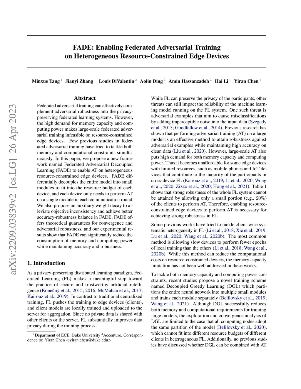 Federated adversarial training can effectively complement adversarial robustness into the privacy-preserving federated learning systems. However, the high demand for memory capacity and computing power makes large-scale federated adversarial training infeasible on resource-constrained edge devices. Few previous studies in federated adversarial training have tried to tackle both memory and computational constraints simultaneously. In this paper, we propose a new framework named Federated Adversarial Decoupled Learning (FADE) to enable AT on heterogeneous resource-constrained edge devices. FADE differentially decouples the entire model into small modules to fit into the resource budget of each device, and each device only needs to perform AT on a single module in each communication round. We also propose an auxiliary weight decay to alleviate objective inconsistency and achieve better accuracy-robustness balance in FADE. FADE offers theoretical guarantees for convergence and adversarial robustness, and our experimental results show that FADE can significantly reduce the consumption of memory and computing power while maintaining accuracy and robustness.