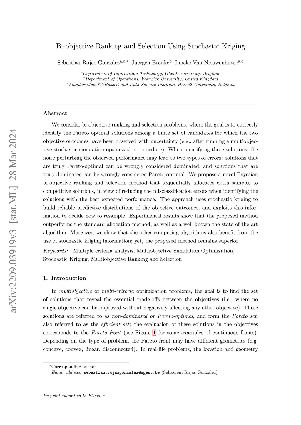 We consider bi-objective ranking and selection problems, where the goal is to correctly identify the Pareto optimal solutions among a finite set of candidates for which the two objective outcomes have been observed with uncertainty (e.g., after running a multiobjective stochastic simulation optimization procedure). When identifying these solutions, the noise perturbing the observed performance may lead to two types of errors: solutions that are truly Pareto-optimal can be wrongly considered dominated, and solutions that are truly dominated can be wrongly considered Pareto-optimal. We propose a novel Bayesian bi-objective ranking and selection method that sequentially allocates extra samples to competitive solutions, in view of reducing the misclassification errors when identifying the solutions with the best expected performance. The approach uses stochastic kriging to build reliable predictive distributions of the objective outcomes, and exploits this information to decide how to resample. Experimental results show that the proposed method outperforms the standard allocation method, as well as a well-known the state-of-the-art algorithm. Moreover, we show that the other competing algorithms also benefit from the use of stochastic kriging information; yet, the proposed method remains superior.