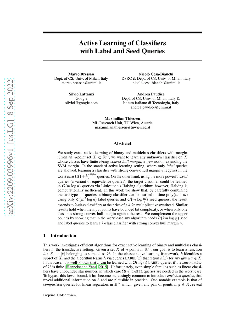 We study exact active learning of binary and multiclass classifiers with margin. Given an -point set , we want to learn any unknown classifier on whose classes have finite strong convex hull margin, a new notion extending the SVM margin. In the standard active learning setting, where only label queries are allowed, learning a classifier with strong convex hull margin requires in the worst case queries. On the other hand, using the more powerful seed queries (a variant of equivalence queries), the target classifier could be learned in queries via Littlestone's Halving algorithm; however, Halving is computationally inefficient. In this work we show that, by carefully combining the two types of queries, a binary classifier can be learned in time using only label queries and seed queries; the result extends to -class classifiers at the price of a multiplicative overhead. Similar results hold when the input points have bounded bit complexity, or when only one class has strong convex hull margin against the rest. We complement the upper bounds by showing that in the worst case any algorithm needs seed and label queries to learn a -class classifier with strong convex hull margin .