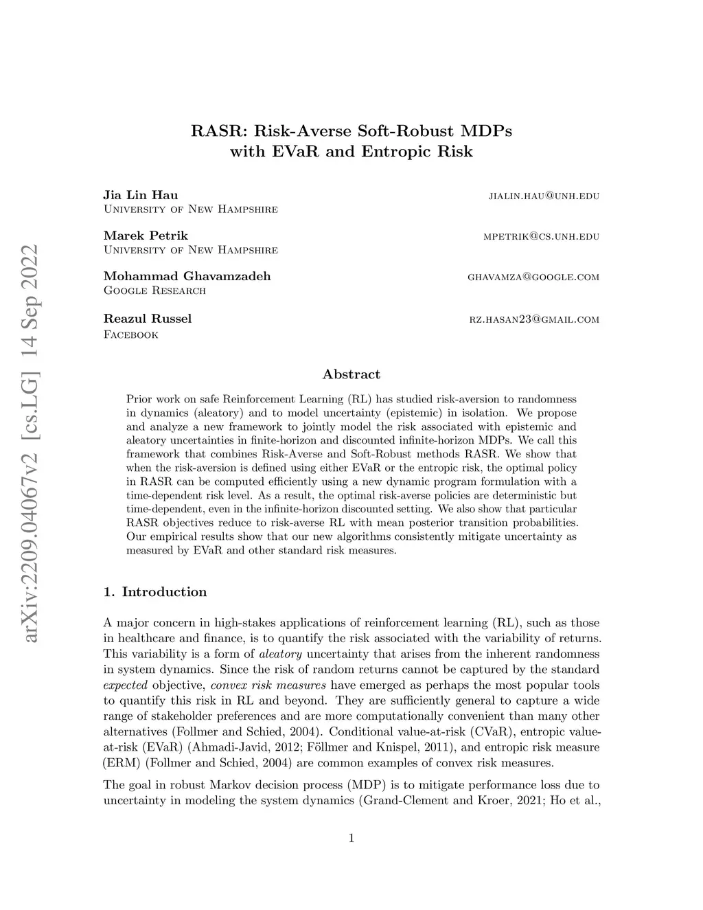 RASR: Risk-Averse Soft-Robust MDPs with EVaR and Entropic Risk