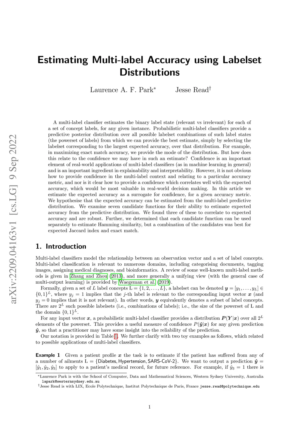A multi-label classifier estimates the binary label state (relevant vs irrelevant) for each of a set of concept labels, for any given instance. Probabilistic multi-label classifiers provide a predictive posterior distribution over all possible labelset combinations of such label states (the powerset of labels) from which we can provide the best estimate, simply by selecting the labelset corresponding to the largest expected accuracy, over that distribution. For example, in maximizing exact match accuracy, we provide the mode of the distribution. But how does this relate to the confidence we may have in such an estimate? Confidence is an important element of real-world applications of multi-label classifiers (as in machine learning in general) and is an important ingredient in explainability and interpretability. However, it is not obvious how to provide confidence in the multi-label context and relating to a particular accuracy metric, and nor is it clear how to provide a confidence which correlates well with the expected accuracy, which would be most valuable in real-world decision making. In this article we estimate the expected accuracy as a surrogate for confidence, for a given accuracy metric. We hypothesise that the expected accuracy can be estimated from the multi-label predictive distribution. We examine seven candidate functions for their ability to estimate expected accuracy from the predictive distribution. We found three of these to correlate to expected accuracy and are robust. Further, we determined that each candidate function can be used separately to estimate Hamming similarity, but a combination of the candidates was best for expected Jaccard index and exact match.