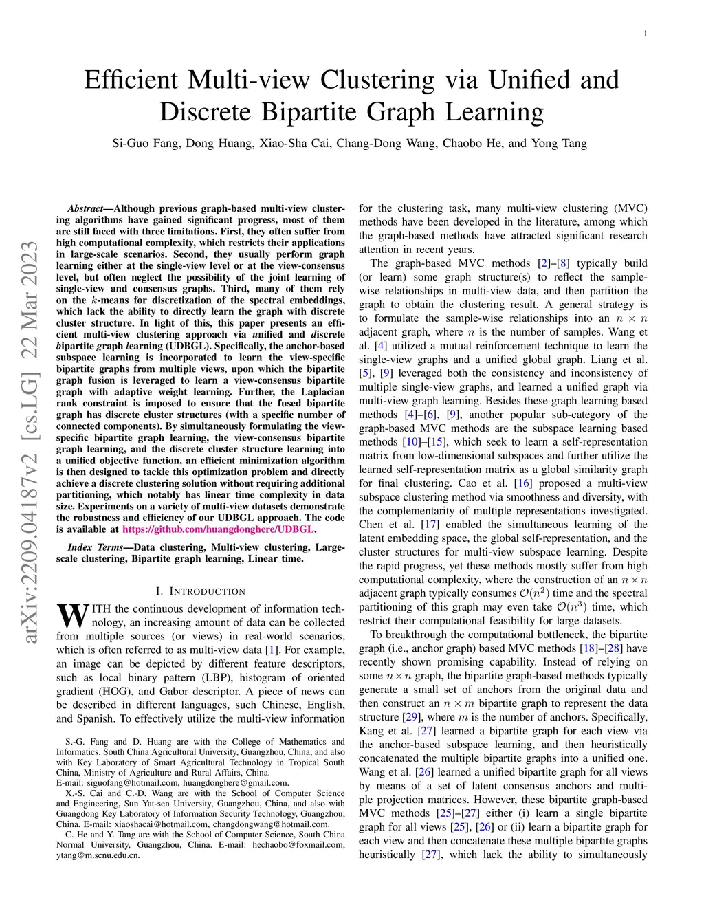 Efficient Multi-view Clustering via Unified and Discrete Bipartite Graph