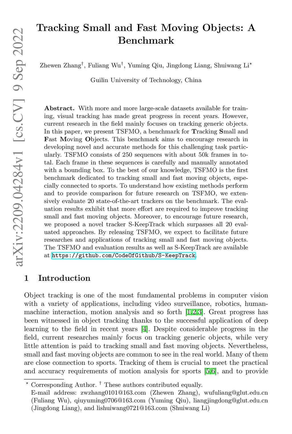 With more and more large-scale datasets available for training, visual tracking has made great progress in recent years. However, current research in the field mainly focuses on tracking generic objects. In this paper, we present TSFMO, a benchmark for \textbf{T}racking \textbf{S}mall and \textbf{F}ast \textbf{M}oving \textbf{O}bjects. This benchmark aims to encourage research in developing novel and accurate methods for this challenging task particularly. TSFMO consists of 250 sequences with about 50k frames in total. Each frame in these sequences is carefully and manually annotated with a bounding box. To the best of our knowledge, TSFMO is the first benchmark dedicated to tracking small and fast moving objects, especially connected to sports. To understand how existing methods perform and to provide comparison for future research on TSFMO, we extensively evaluate 20 state-of-the-art trackers on the benchmark. The evaluation results exhibit that more effort are required to improve tracking small and fast moving objects. Moreover, to encourage future research, we proposed a novel tracker S-KeepTrack which surpasses all 20 evaluated approaches. By releasing TSFMO, we expect to facilitate future researches and applications of tracking small and fast moving objects. The TSFMO and evaluation results as well as S-KeepTrack are available at \url{https://github.com/CodeOfGithub/S-KeepTrack}.