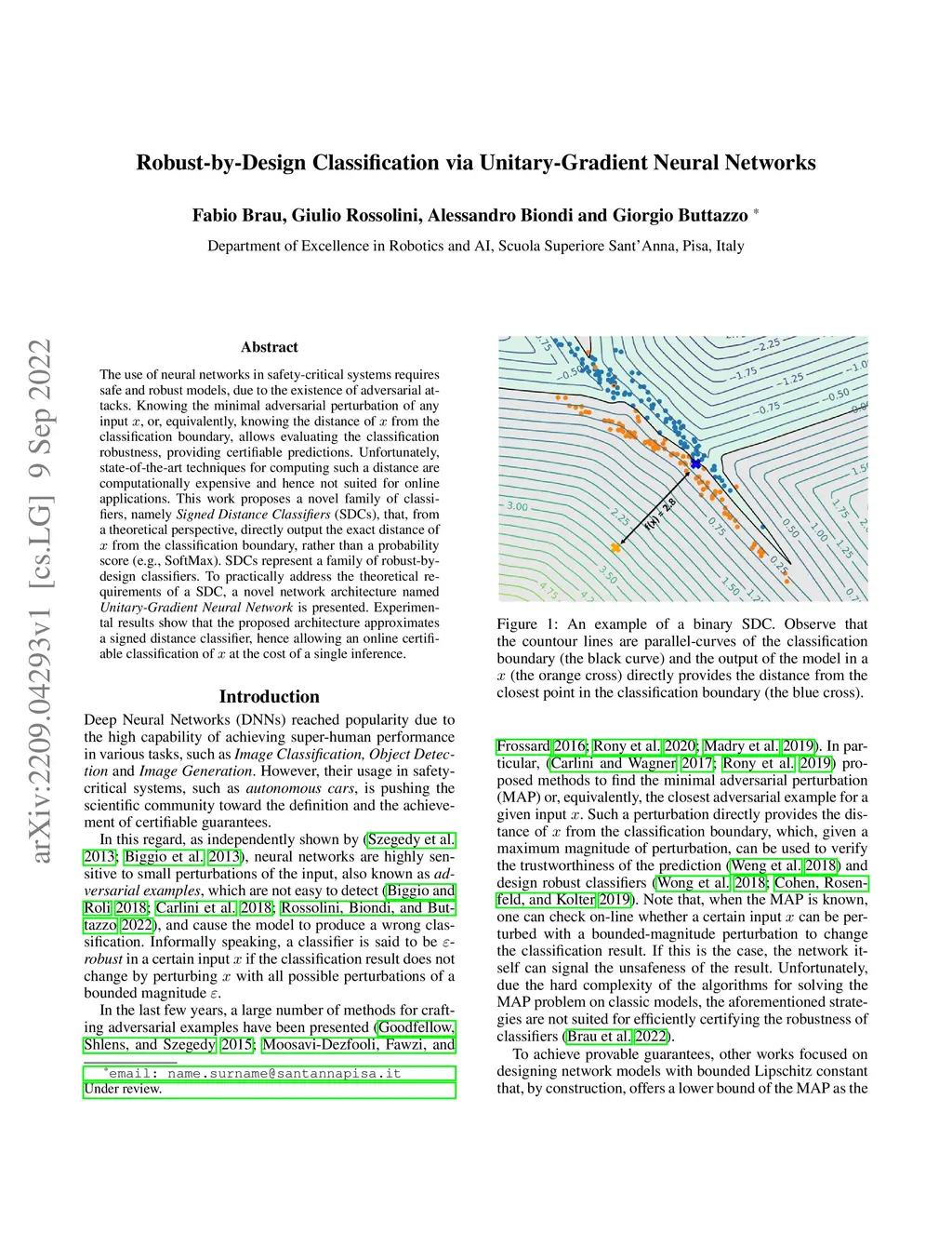 The use of neural networks in safety-critical systems requires safe and robust models, due to the existence of adversarial attacks. Knowing the minimal adversarial perturbation of any input x, or, equivalently, knowing the distance of x from the classification boundary, allows evaluating the classification robustness, providing certifiable predictions. Unfortunately, state-of-the-art techniques for computing such a distance are computationally expensive and hence not suited for online applications. This work proposes a novel family of classifiers, namely Signed Distance Classifiers (SDCs), that, from a theoretical perspective, directly output the exact distance of x from the classification boundary, rather than a probability score (e.g., SoftMax). SDCs represent a family of robust-by-design classifiers. To practically address the theoretical requirements of a SDC, a novel network architecture named Unitary-Gradient Neural Network is presented. Experimental results show that the proposed architecture approximates a signed distance classifier, hence allowing an online certifiable classification of x at the cost of a single inference.