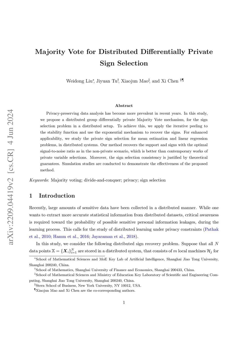 Privacy-preserving data analysis has become more prevalent in recent years. In this study, we propose a distributed group differentially private Majority Vote mechanism, for the sign selection problem in a distributed setup. To achieve this, we apply the iterative peeling to the stability function and use the exponential mechanism to recover the signs. For enhanced applicability, we study the private sign selection for mean estimation and linear regression problems, in distributed systems. Our method recovers the support and signs with the optimal signal-to-noise ratio as in the non-private scenario, which is better than contemporary works of private variable selections. Moreover, the sign selection consistency is justified by theoretical guarantees. Simulation studies are conducted to demonstrate the effectiveness of the proposed method.