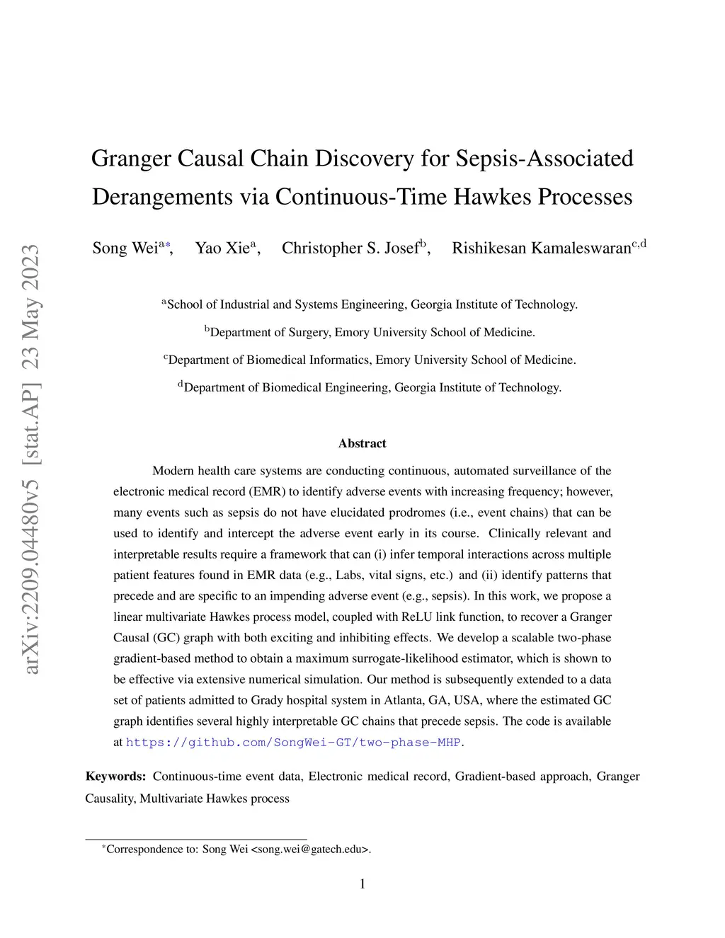 Modern health care systems are conducting continuous, automated surveillance of the electronic medical record (EMR) to identify adverse events with increasing frequency; however, many events such as sepsis do not have elucidated prodromes (i.e., event chains) that can be used to identify and intercept the adverse event early in its course. Clinically relevant and interpretable results require a framework that can (i) infer temporal interactions across multiple patient features found in EMR data (e.g., Labs, vital signs, etc.) and (ii) identify patterns that precede and are specific to an impending adverse event (e.g., sepsis). In this work, we propose a linear multivariate Hawkes process model, coupled with ReLU link function, to recover a Granger Causal (GC) graph with both exciting and inhibiting effects. We develop a scalable two-phase gradient-based method to obtain a maximum surrogate-likelihood estimator, which is shown to be effective via extensive numerical simulation. Our method is subsequently extended to a data set of patients admitted to Grady hospital system in Atlanta, GA, USA, where the estimated GC graph identifies several highly interpretable GC chains that precede sepsis. The code is available at \url{https://github.com/SongWei-GT/two-phase-MHP}.