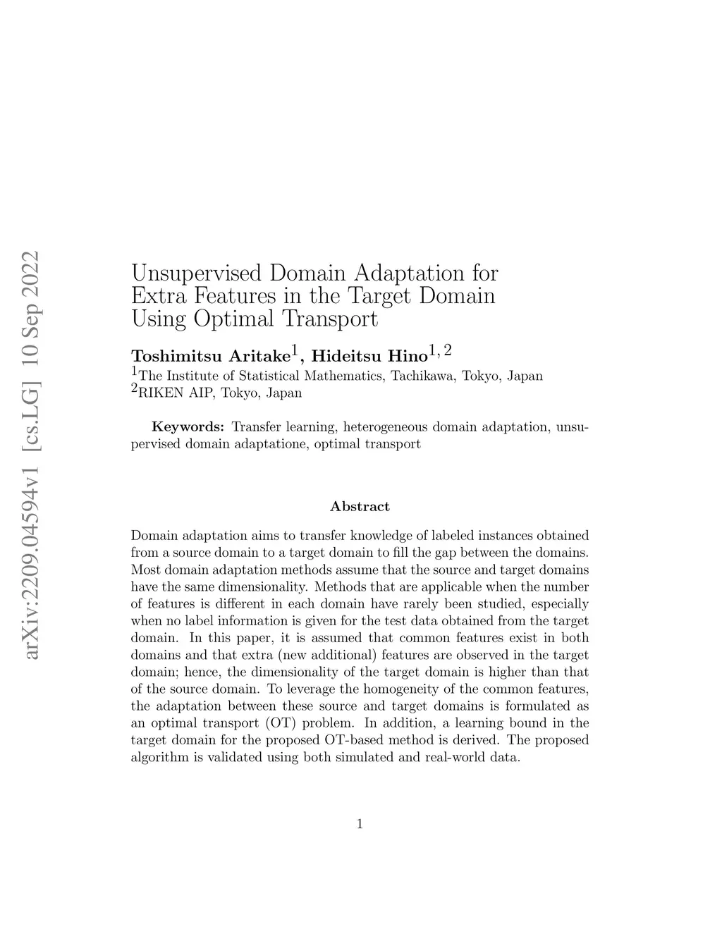 Domain adaptation aims to transfer knowledge of labeled instances obtained from a source domain to a target domain to fill the gap between the domains. Most domain adaptation methods assume that the source and target domains have the same dimensionality. Methods that are applicable when the number of features is different in each domain have rarely been studied, especially when no label information is given for the test data obtained from the target domain. In this paper, it is assumed that common features exist in both domains and that extra (new additional) features are observed in the target domain; hence, the dimensionality of the target domain is higher than that of the source domain. To leverage the homogeneity of the common features, the adaptation between these source and target domains is formulated as an optimal transport (OT) problem. In addition, a learning bound in the target domain for the proposed OT-based method is derived. The proposed algorithm is validated using both simulated and real-world data.