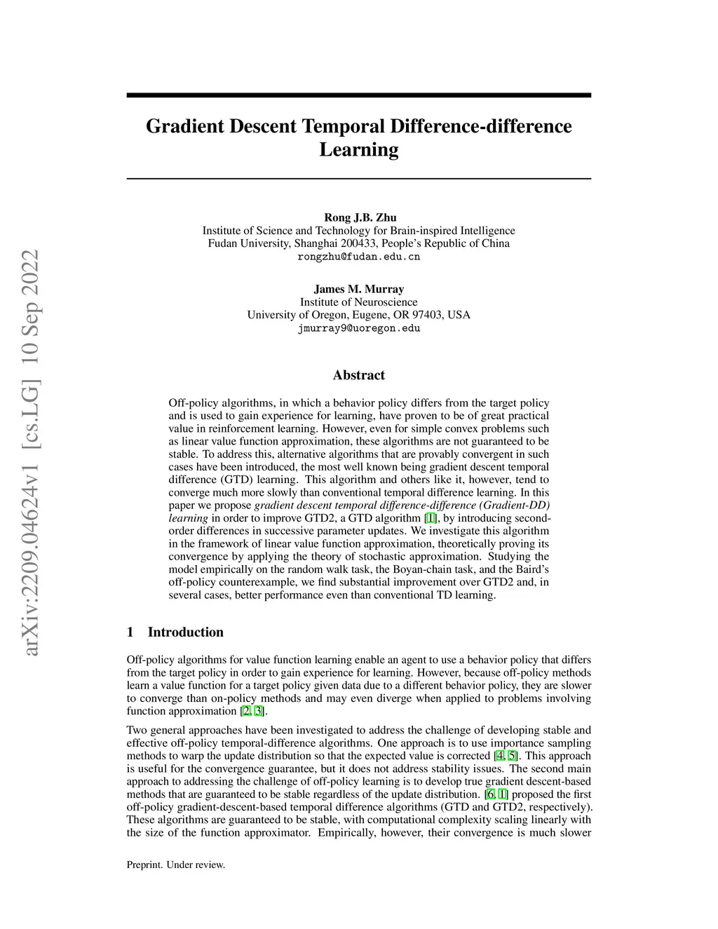 Off-policy algorithms, in which a behavior policy differs from the target policy and is used to gain experience for learning, have proven to be of great practical value in reinforcement learning. However, even for simple convex problems such as linear value function approximation, these algorithms are not guaranteed to be stable. To address this, alternative algorithms that are provably convergent in such cases have been introduced, the most well known being gradient descent temporal difference (GTD) learning. This algorithm and others like it, however, tend to converge much more slowly than conventional temporal difference learning. In this paper we propose gradient descent temporal difference-difference (Gradient-DD) learning in order to improve GTD2, a GTD algorithm, by introducing second-order differences in successive parameter updates. We investigate this algorithm in the framework of linear value function approximation, theoretically proving its convergence by applying the theory of stochastic approximation. %analytically showing its improvement over GTD2. Studying the model empirically on the random walk task, the Boyan-chain task, and the Baird's off-policy counterexample, we find substantial improvement over GTD2 and, in several cases, better performance even than conventional TD learning.