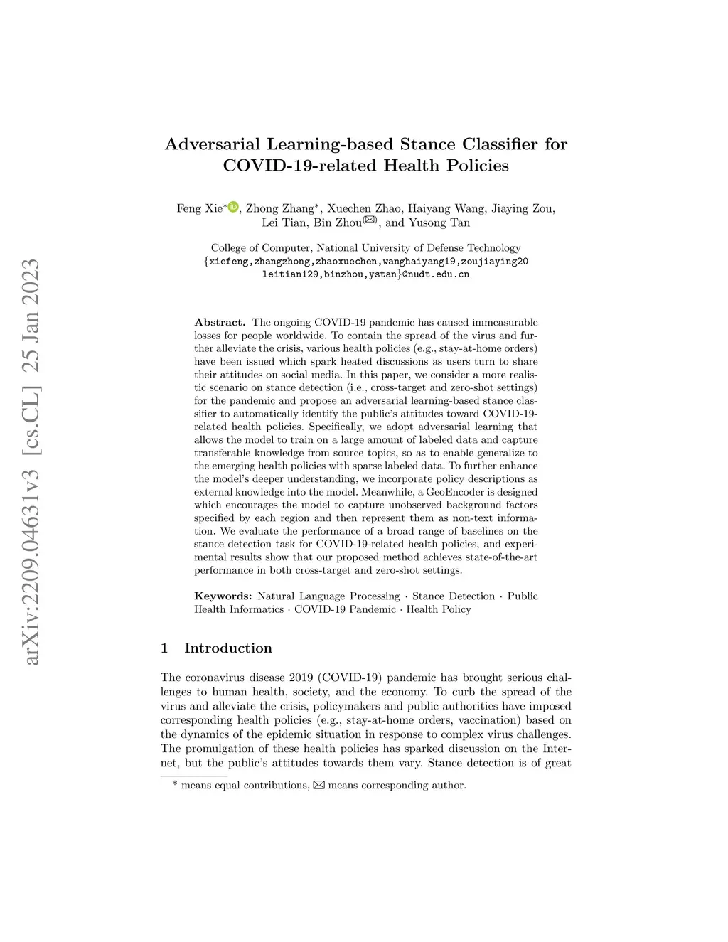 Adversarial Learning-based Stance Classifier for COVID-19-related Health