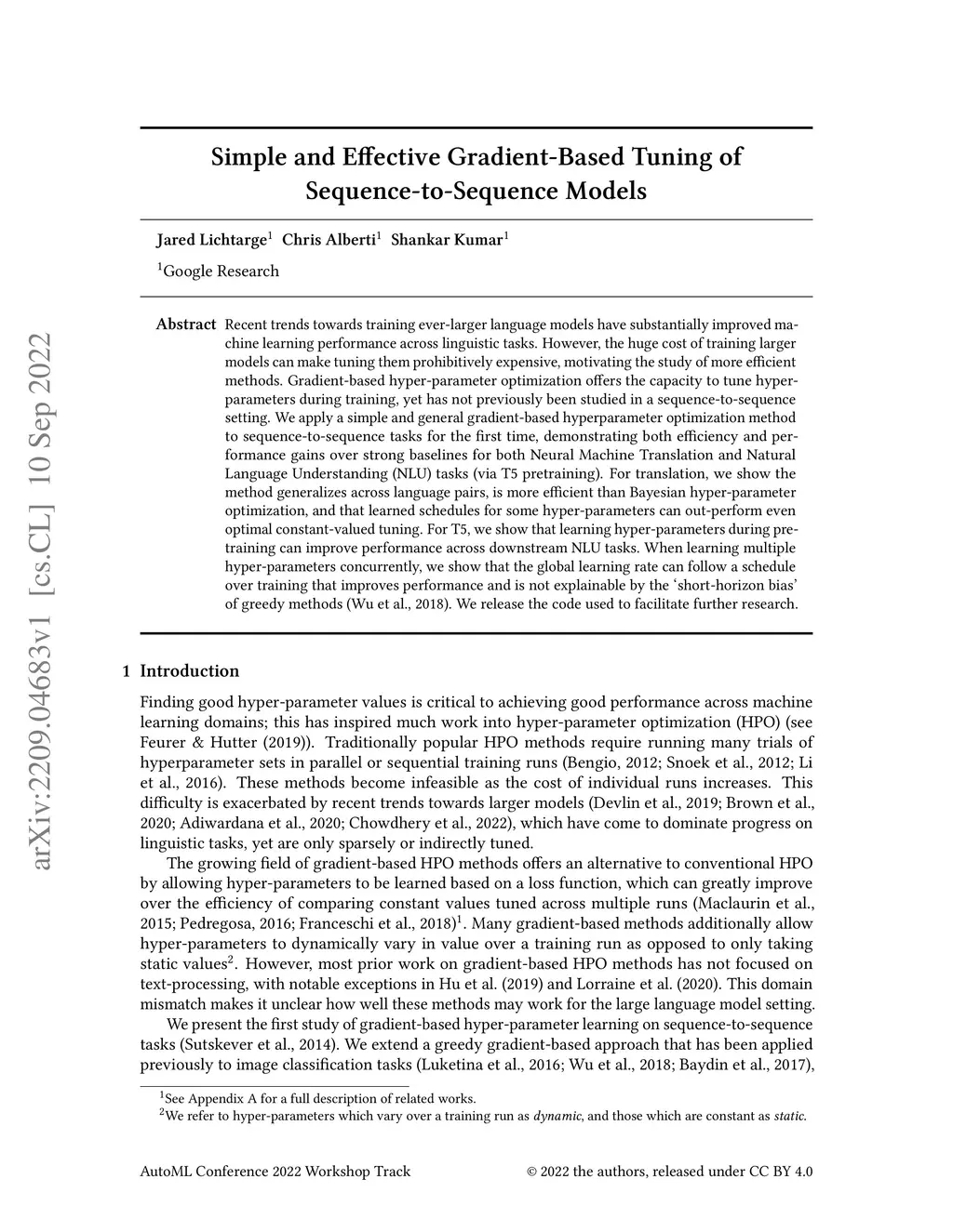 Recent trends towards training ever-larger language models have substantially improved machine learning performance across linguistic tasks. However, the huge cost of training larger models can make tuning them prohibitively expensive, motivating the study of more efficient methods. Gradient-based hyper-parameter optimization offers the capacity to tune hyper-parameters during training, yet has not previously been studied in a sequence-to-sequence setting. We apply a simple and general gradient-based hyperparameter optimization method to sequence-to-sequence tasks for the first time, demonstrating both efficiency and performance gains over strong baselines for both Neural Machine Translation and Natural Language Understanding (NLU) tasks (via T5 pretraining). For translation, we show the method generalizes across language pairs, is more efficient than Bayesian hyper-parameter optimization, and that learned schedules for some hyper-parameters can out-perform even optimal constant-valued tuning. For T5, we show that learning hyper-parameters during pretraining can improve performance across downstream NLU tasks. When learning multiple hyper-parameters concurrently, we show that the global learning rate can follow a schedule over training that improves performance and is not explainable by the `short-horizon bias' of greedy methods \citep{wu2018}. We release the code used to facilitate further research.