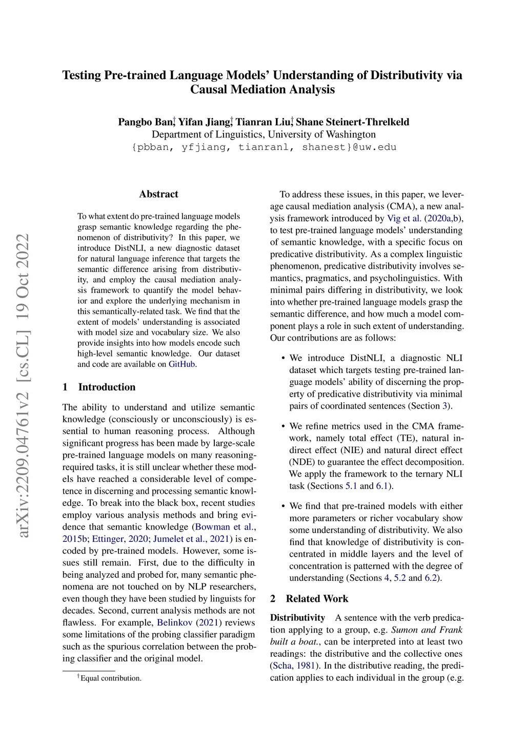 To what extent do pre-trained language models grasp semantic knowledge regarding the phenomenon of distributivity? In this paper, we introduce DistNLI, a new diagnostic dataset for natural language inference that targets the semantic difference arising from distributivity, and employ the causal mediation analysis framework to quantify the model behavior and explore the underlying mechanism in this semantically-related task. We find that the extent of models' understanding is associated with model size and vocabulary size. We also provide insights into how models encode such high-level semantic knowledge.