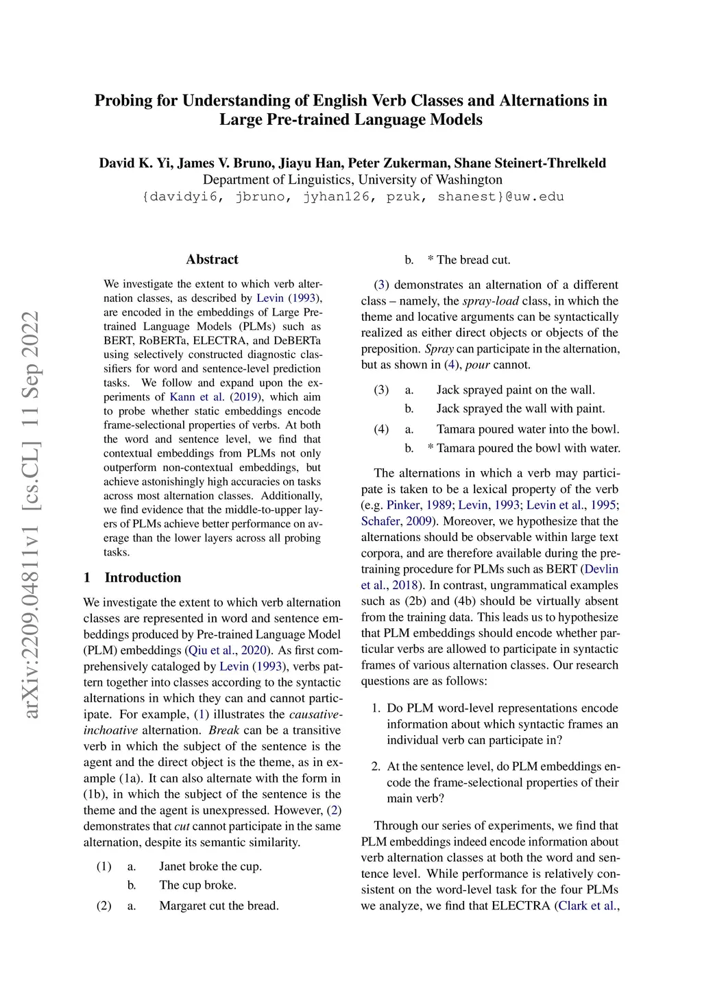 We investigate the extent to which verb alternation classes, as described by Levin (1993), are encoded in the embeddings of Large Pre-trained Language Models (PLMs) such as BERT, RoBERTa, ELECTRA, and DeBERTa using selectively constructed diagnostic classifiers for word and sentence-level prediction tasks. We follow and expand upon the experiments of Kann et al. (2019), which aim to probe whether static embeddings encode frame-selectional properties of verbs. At both the word and sentence level, we find that contextual embeddings from PLMs not only outperform non-contextual embeddings, but achieve astonishingly high accuracies on tasks across most alternation classes. Additionally, we find evidence that the middle-to-upper layers of PLMs achieve better performance on average than the lower layers across all probing tasks.