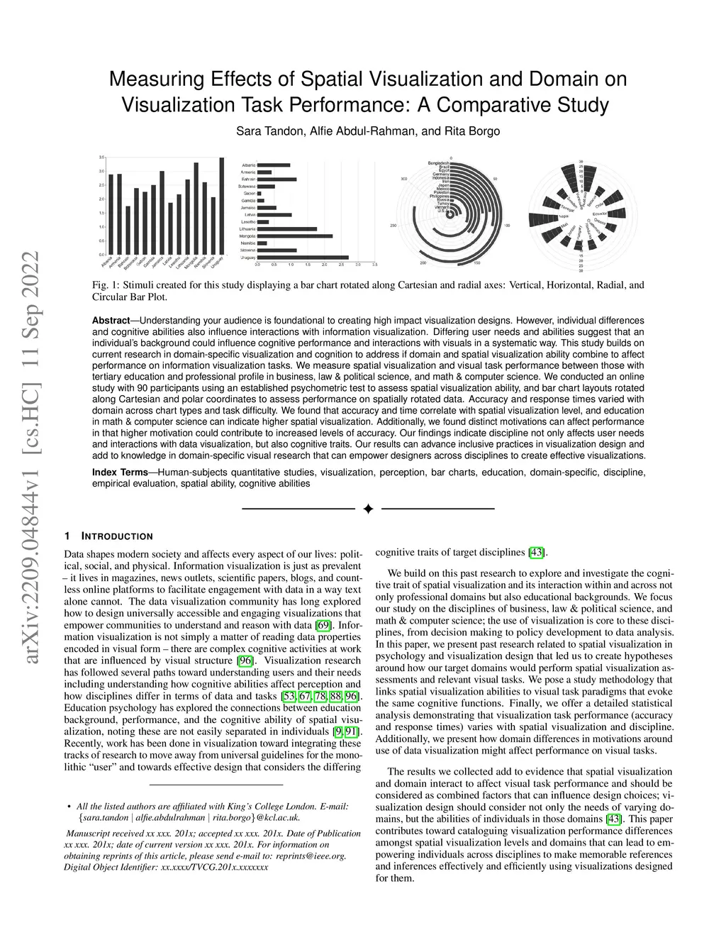 Understanding your audience is foundational to creating high impact visualization designs. However, individual differences and cognitive abilities also influence interactions with information visualization. Differing user needs and abilities suggest that an individual's background could influence cognitive performance and interactions with visuals in a systematic way. This study builds on current research in domain-specific visualization and cognition to address if domain and spatial visualization ability combine to affect performance on information visualization tasks. We measure spatial visualization and visual task performance between those with tertiary education and professional profile in business, law & political science, and math & computer science. We conducted an online study with 90 participants using an established psychometric test to assess spatial visualization ability, and bar chart layouts rotated along Cartesian and polar coordinates to assess performance on spatially rotated data. Accuracy and response times varied with domain across chart types and task difficulty. We found that accuracy and time correlate with spatial visualization level, and education in math & computer science can indicate higher spatial visualization. Additionally, we found distinct motivations can affect performance in that higher motivation could contribute to increased levels of accuracy. Our findings indicate discipline not only affects user needs and interactions with data visualization, but also cognitive traits. Our results can advance inclusive practices in visualization design and add to knowledge in domain-specific visual research that can empower designers across disciplines to create effective visualizations.