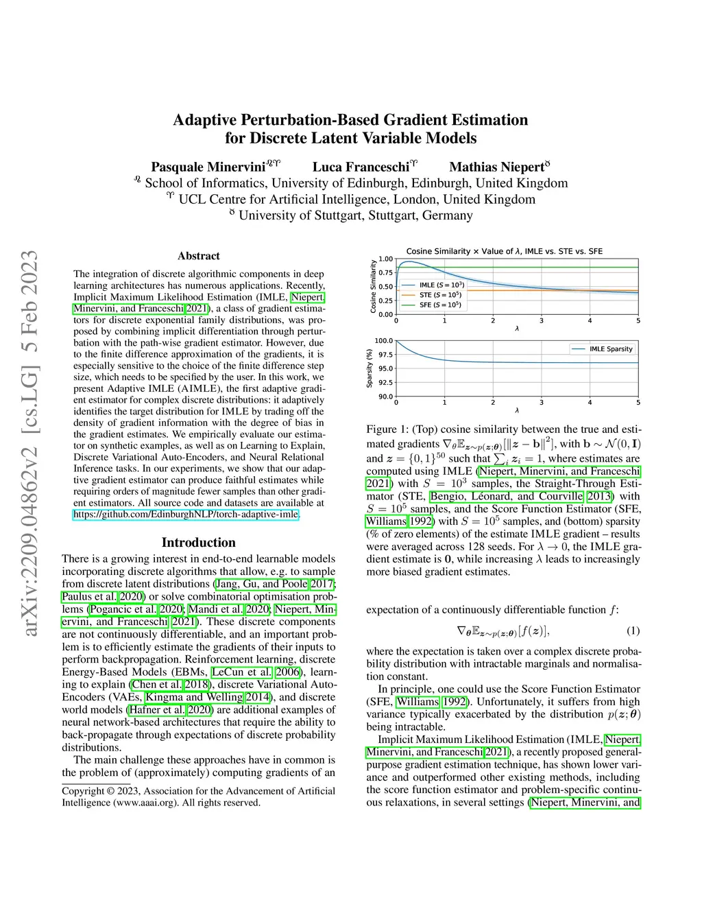 The integration of discrete algorithmic components in deep learning architectures has numerous applications. Recently, Implicit Maximum Likelihood Estimation (IMLE, Niepert, Minervini, and Franceschi 2021), a class of gradient estimators for discrete exponential family distributions, was proposed by combining implicit differentiation through perturbation with the path-wise gradient estimator. However, due to the finite difference approximation of the gradients, it is especially sensitive to the choice of the finite difference step size, which needs to be specified by the user. In this work, we present Adaptive IMLE (AIMLE), the first adaptive gradient estimator for complex discrete distributions: it adaptively identifies the target distribution for IMLE by trading off the density of gradient information with the degree of bias in the gradient estimates. We empirically evaluate our estimator on synthetic examples, as well as on Learning to Explain, Discrete Variational Auto-Encoders, and Neural Relational Inference tasks. In our experiments, we show that our adaptive gradient estimator can produce faithful estimates while requiring orders of magnitude fewer samples than other gradient estimators.