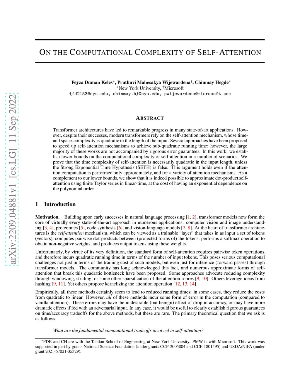 Transformer architectures have led to remarkable progress in many state-of-art applications. However, despite their successes, modern transformers rely on the self-attention mechanism, whose time- and space-complexity is quadratic in the length of the input. Several approaches have been proposed to speed up self-attention mechanisms to achieve sub-quadratic running time; however, the large majority of these works are not accompanied by rigorous error guarantees. In this work, we establish lower bounds on the computational complexity of self-attention in a number of scenarios. We prove that the time complexity of self-attention is necessarily quadratic in the input length, unless the Strong Exponential Time Hypothesis (SETH) is false. This argument holds even if the attention computation is performed only approximately, and for a variety of attention mechanisms. As a complement to our lower bounds, we show that it is indeed possible to approximate dot-product self-attention using finite Taylor series in linear-time, at the cost of having an exponential dependence on the polynomial order.