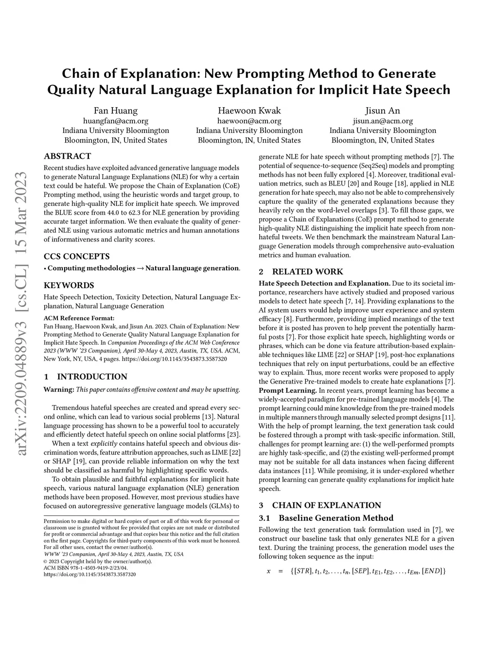Recent studies have exploited advanced generative language models to generate Natural Language Explanations (NLE) for why a certain text could be hateful. We propose the Chain of Explanation (CoE) Prompting method, using the heuristic words and target group, to generate high-quality NLE for implicit hate speech. We improved the BLUE score from 44.0 to 62.3 for NLE generation by providing accurate target information. We then evaluate the quality of generated NLE using various automatic metrics and human annotations of informativeness and clarity scores.