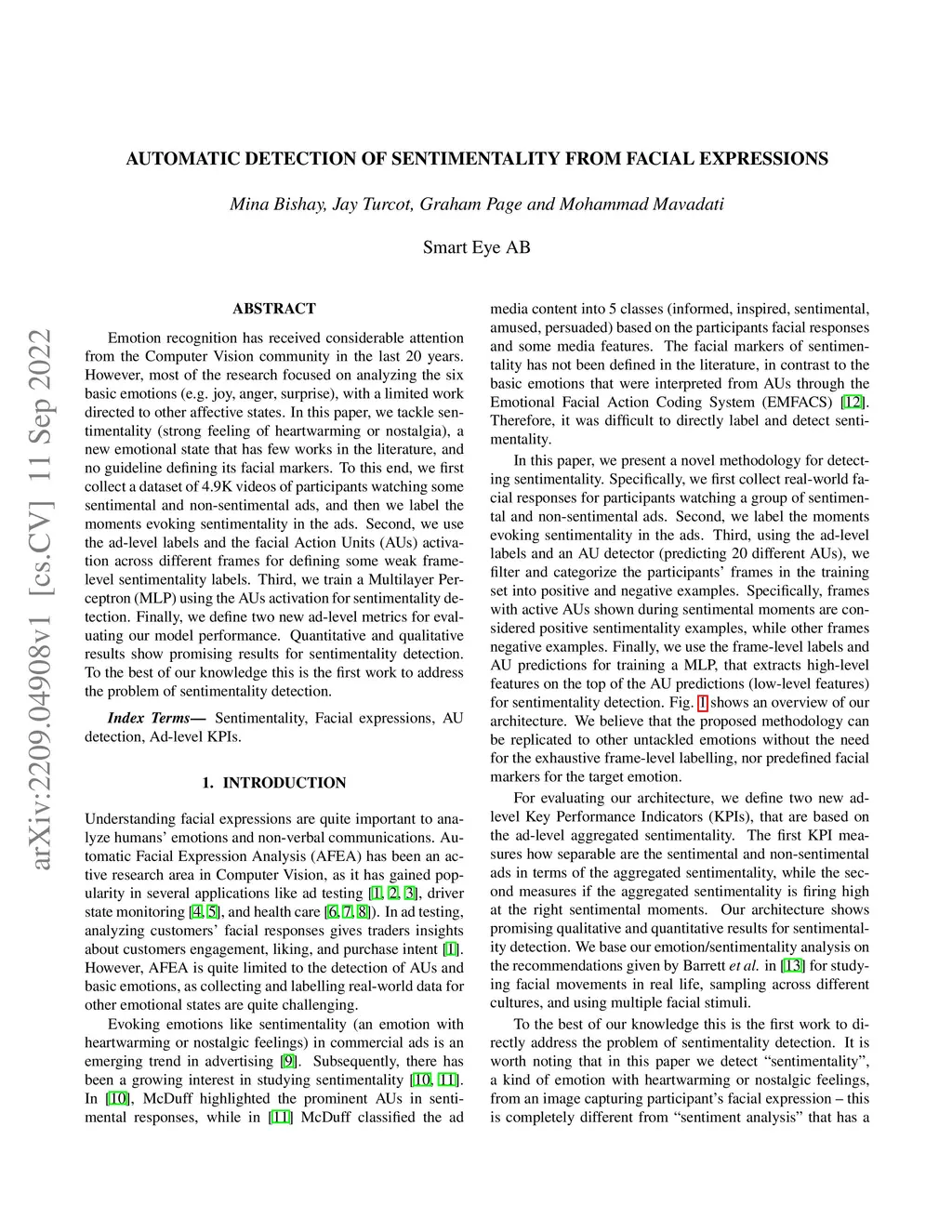 Emotion recognition has received considerable attention from the Computer Vision community in the last 20 years. However, most of the research focused on analyzing the six basic emotions (e.g. joy, anger, surprise), with a limited work directed to other affective states. In this paper, we tackle sentimentality (strong feeling of heartwarming or nostalgia), a new emotional state that has few works in the literature, and no guideline defining its facial markers. To this end, we first collect a dataset of 4.9K videos of participants watching some sentimental and non-sentimental ads, and then we label the moments evoking sentimentality in the ads. Second, we use the ad-level labels and the facial Action Units (AUs) activation across different frames for defining some weak frame-level sentimentality labels. Third, we train a Multilayer Perceptron (MLP) using the AUs activation for sentimentality detection. Finally, we define two new ad-level metrics for evaluating our model performance. Quantitative and qualitative results show promising results for sentimentality detection. To the best of our knowledge this is the first work to address the problem of sentimentality detection.
