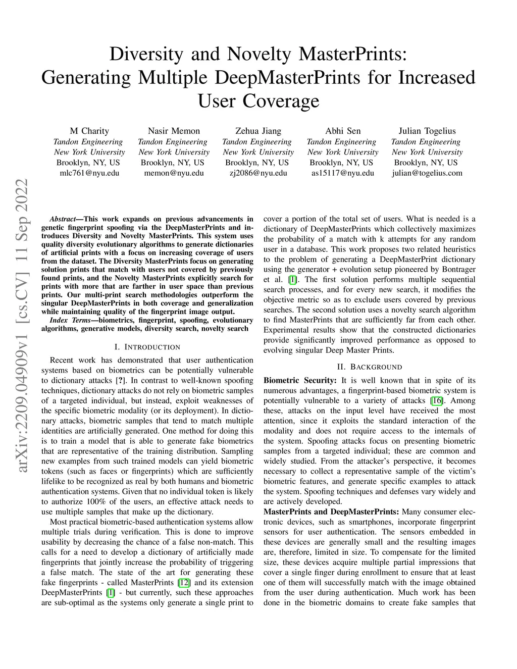 This work expands on previous advancements in genetic fingerprint spoofing via the DeepMasterPrints and introduces Diversity and Novelty MasterPrints. This system uses quality diversity evolutionary algorithms to generate dictionaries of artificial prints with a focus on increasing coverage of users from the dataset. The Diversity MasterPrints focus on generating solution prints that match with users not covered by previously found prints, and the Novelty MasterPrints explicitly search for prints with more that are farther in user space than previous prints. Our multi-print search methodologies outperform the singular DeepMasterPrints in both coverage and generalization while maintaining quality of the fingerprint image output.