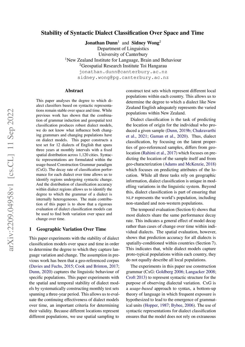 This paper analyses the degree to which dialect classifiers based on syntactic representations remain stable over space and time. While previous work has shown that the combination of grammar induction and geospatial text classification produces robust dialect models, we do not know what influence both changing grammars and changing populations have on dialect models. This paper constructs a test set for 12 dialects of English that spans three years at monthly intervals with a fixed spatial distribution across 1,120 cities. Syntactic representations are formulated within the usage-based Construction Grammar paradigm (CxG). The decay rate of classification performance for each dialect over time allows us to identify regions undergoing syntactic change. And the distribution of classification accuracy within dialect regions allows us to identify the degree to which the grammar of a dialect is internally heterogeneous. The main contribution of this paper is to show that a rigorous evaluation of dialect classification models can be used to find both variation over space and change over time.
