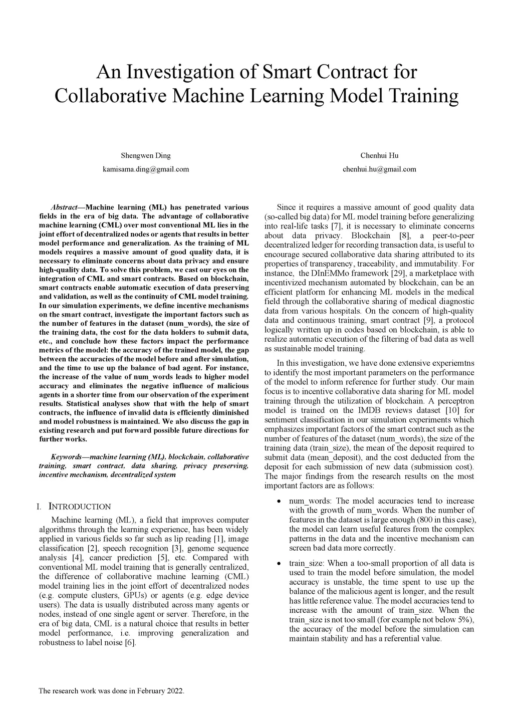 Machine learning (ML) has penetrated various fields in the era of big data. The advantage of collaborative machine learning (CML) over most conventional ML lies in the joint effort of decentralized nodes or agents that results in better model performance and generalization. As the training of ML models requires a massive amount of good quality data, it is necessary to eliminate concerns about data privacy and ensure high-quality data. To solve this problem, we cast our eyes on the integration of CML and smart contracts. Based on blockchain, smart contracts enable automatic execution of data preserving and validation, as well as the continuity of CML model training. In our simulation experiments, we define incentive mechanisms on the smart contract, investigate the important factors such as the number of features in the dataset (num_words), the size of the training data, the cost for the data holders to submit data, etc., and conclude how these factors impact the performance metrics of the model: the accuracy of the trained model, the gap between the accuracies of the model before and after simulation, and the time to use up the balance of bad agent. For instance, the increase of the value of num_words leads to higher model accuracy and eliminates the negative influence of malicious agents in a shorter time from our observation of the experiment results. Statistical analyses show that with the help of smart contracts, the influence of invalid data is efficiently diminished and model robustness is maintained. We also discuss the gap in existing research and put forward possible future directions for further works.
