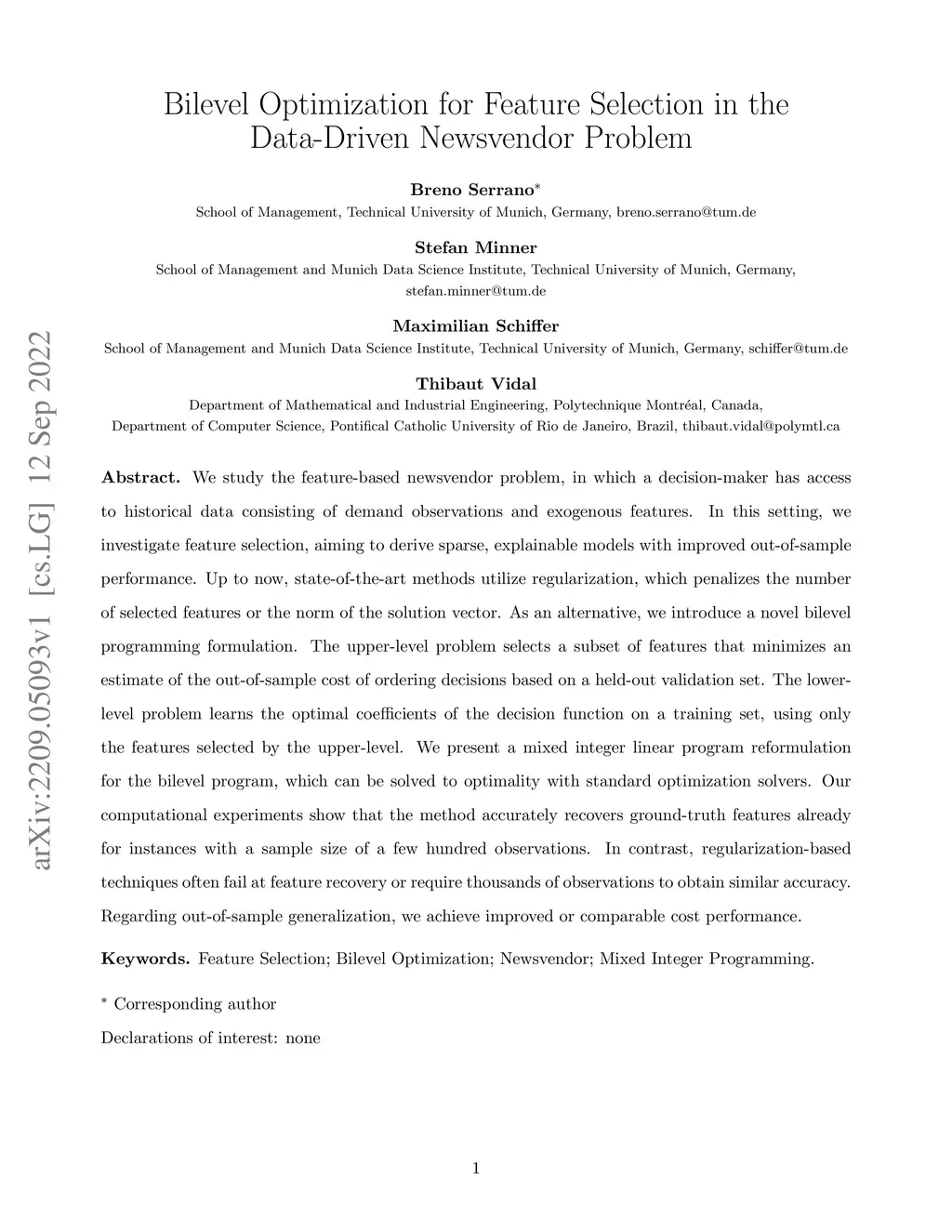 Bilevel Optimization for Feature Selection in the Data-Driven Newsvendor