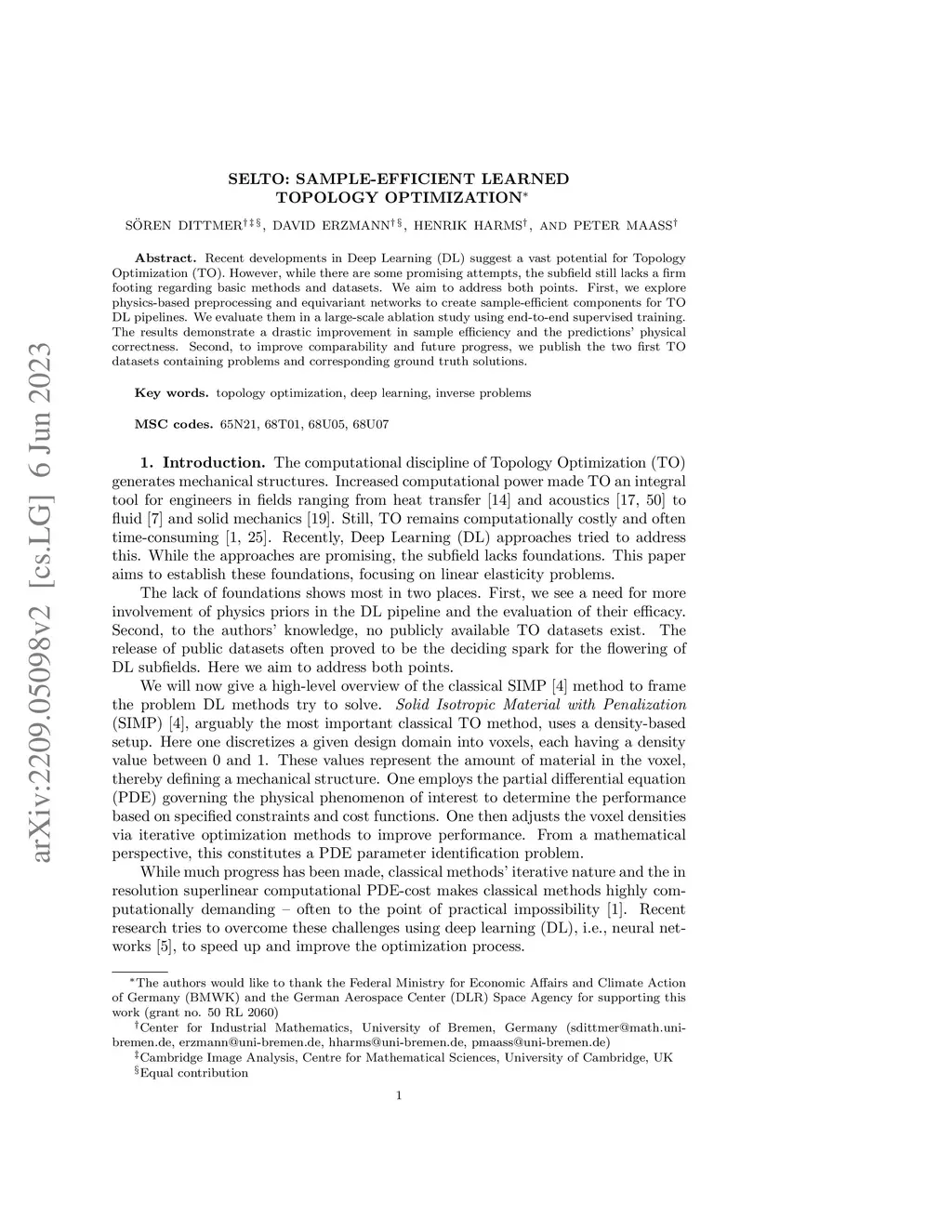 Recent developments in Deep Learning (DL) suggest a vast potential for Topology Optimization (TO). However, while there are some promising attempts, the subfield still lacks a firm footing regarding basic methods and datasets. We aim to address both points. First, we explore physics-based preprocessing and equivariant networks to create sample-efficient components for TO DL pipelines. We evaluate them in a large-scale ablation study using end-to-end supervised training. The results demonstrate a drastic improvement in sample efficiency and the predictions' physical correctness. Second, to improve comparability and future progress, we publish the two first TO datasets containing problems and corresponding ground truth solutions.