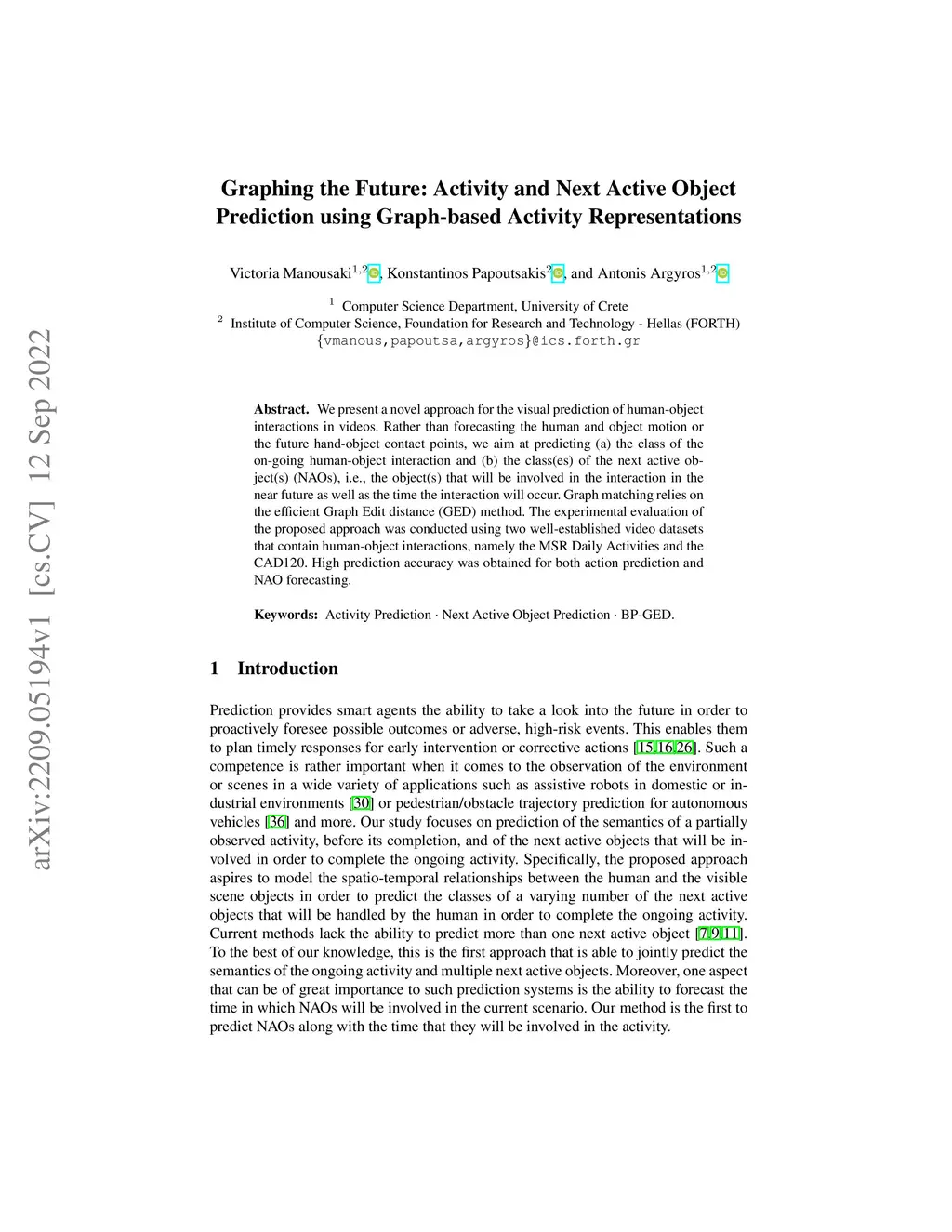 We present a novel approach for the visual prediction of human-object interactions in videos. Rather than forecasting the human and object motion or the future hand-object contact points, we aim at predicting (a)the class of the on-going human-object interaction and (b) the class(es) of the next active object(s) (NAOs), i.e., the object(s) that will be involved in the interaction in the near future as well as the time the interaction will occur. Graph matching relies on the efficient Graph Edit distance (GED) method. The experimental evaluation of the proposed approach was conducted using two well-established video datasets that contain human-object interactions, namely the MSR Daily Activities and the CAD120. High prediction accuracy was obtained for both action prediction and NAO forecasting.