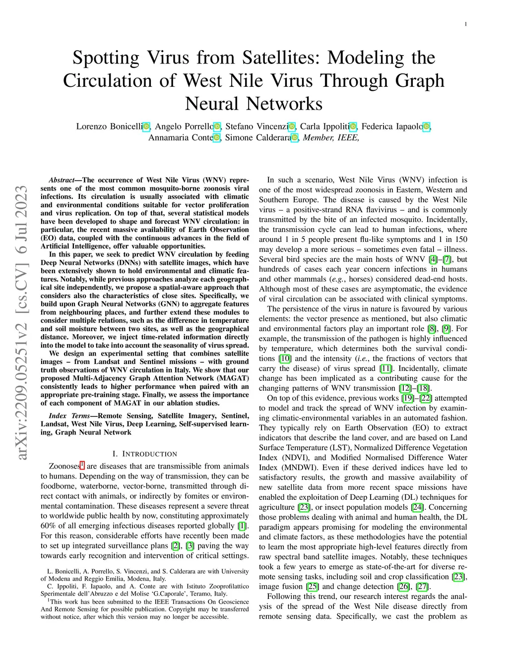 The occurrence of West Nile Virus (WNV) represents one of the most common mosquito-borne zoonosis viral infections. Its circulation is usually associated with climatic and environmental conditions suitable for vector proliferation and virus replication. On top of that, several statistical models have been developed to shape and forecast WNV circulation: in particular, the recent massive availability of Earth Observation (EO) data, coupled with the continuous advances in the field of Artificial Intelligence, offer valuable opportunities. In this paper, we seek to predict WNV circulation by feeding Deep Neural Networks (DNNs) with satellite images, which have been extensively shown to hold environmental and climatic features. Notably, while previous approaches analyze each geographical site independently, we propose a spatial-aware approach that considers also the characteristics of close sites. Specifically, we build upon Graph Neural Networks (GNN) to aggregate features from neighbouring places, and further extend these modules to consider multiple relations, such as the difference in temperature and soil moisture between two sites, as well as the geographical distance. Moreover, we inject time-related information directly into the model to take into account the seasonality of virus spread. We design an experimental setting that combines satellite images - from Landsat and Sentinel missions - with ground truth observations of WNV circulation in Italy. We show that our proposed Multi-Adjacency Graph Attention Network (MAGAT) consistently leads to higher performance when paired with an appropriate pre-training stage. Finally, we assess the importance of each component of MAGAT in our ablation studies.