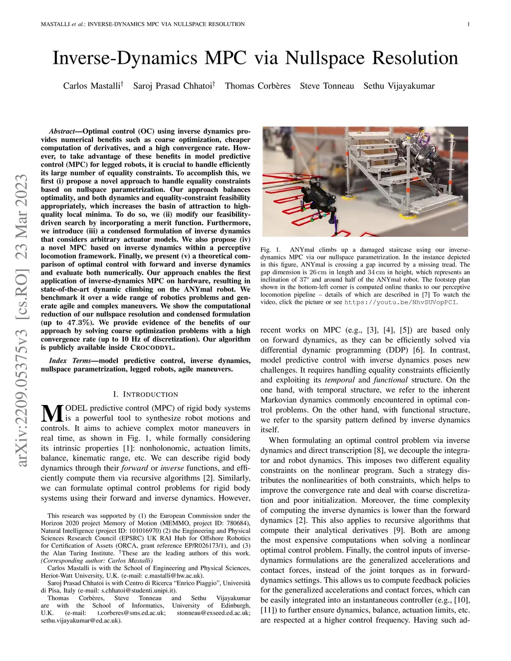 Optimal control (OC) using inverse dynamics provides numerical benefits such as coarse optimization, cheaper computation of derivatives, and a high convergence rate. However, to take advantage of these benefits in model predictive control (MPC) for legged robots, it is crucial to handle efficiently its large number of equality constraints. To accomplish this, we first (i) propose a novel approach to handle equality constraints based on nullspace parametrization. Our approach balances optimality, and both dynamics and equality-constraint feasibility appropriately, which increases the basin of attraction to high-quality local minima. To do so, we (ii) modify our feasibility-driven search by incorporating a merit function. Furthermore, we introduce (iii) a condensed formulation of inverse dynamics that considers arbitrary actuator models. We also propose (iv) a novel MPC based on inverse dynamics within a perceptive locomotion framework. Finally, we present (v) a theoretical comparison of optimal control with forward and inverse dynamics and evaluate both numerically. Our approach enables the first application of inverse-dynamics MPC on hardware, resulting in state-of-the-art dynamic climbing on the ANYmal robot. We benchmark it over a wide range of robotics problems and generate agile and complex maneuvers. We show the computational reduction of our nullspace resolution and condensed formulation (up to 47.3%). We provide evidence of the benefits of our approach by solving coarse optimization problems with a high convergence rate (up to 10 Hz of discretization). Our algorithm is publicly available inside CROCODDYL.