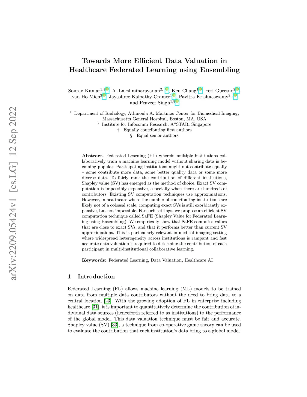 Federated Learning (FL) wherein multiple institutions collaboratively train a machine learning model without sharing data is becoming popular. Participating institutions might not contribute equally, some contribute more data, some better quality data or some more diverse data. To fairly rank the contribution of different institutions, Shapley value (SV) has emerged as the method of choice. Exact SV computation is impossibly expensive, especially when there are hundreds of contributors. Existing SV computation techniques use approximations. However, in healthcare where the number of contributing institutions are likely not of a colossal scale, computing exact SVs is still exorbitantly expensive, but not impossible. For such settings, we propose an efficient SV computation technique called SaFE (Shapley Value for Federated Learning using Ensembling). We empirically show that SaFE computes values that are close to exact SVs, and that it performs better than current SV approximations. This is particularly relevant in medical imaging setting where widespread heterogeneity across institutions is rampant and fast accurate data valuation is required to determine the contribution of each participant in multi-institutional collaborative learning.
