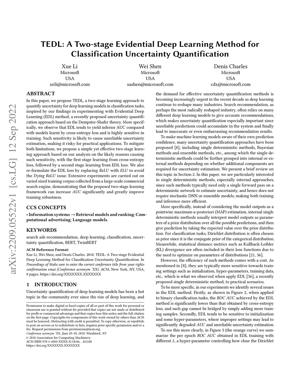 In this paper, we propose TEDL, a two-stage learning approach to quantify uncertainty for deep learning models in classification tasks, inspired by our findings in experimenting with Evidential Deep Learning (EDL) method, a recently proposed uncertainty quantification approach based on the Dempster-Shafer theory. More specifically, we observe that EDL tends to yield inferior AUC compared with models learnt by cross-entropy loss and is highly sensitive in training. Such sensitivity is likely to cause unreliable uncertainty estimation, making it risky for practical applications. To mitigate both limitations, we propose a simple yet effective two-stage learning approach based on our analysis on the likely reasons causing such sensitivity, with the first stage learning from cross-entropy loss, followed by a second stage learning from EDL loss. We also re-formulate the EDL loss by replacing ReLU with ELU to avoid the Dying ReLU issue. Extensive experiments are carried out on varied sized training corpus collected from a large-scale commercial search engine, demonstrating that the proposed two-stage learning framework can increase AUC significantly and greatly improve training robustness.