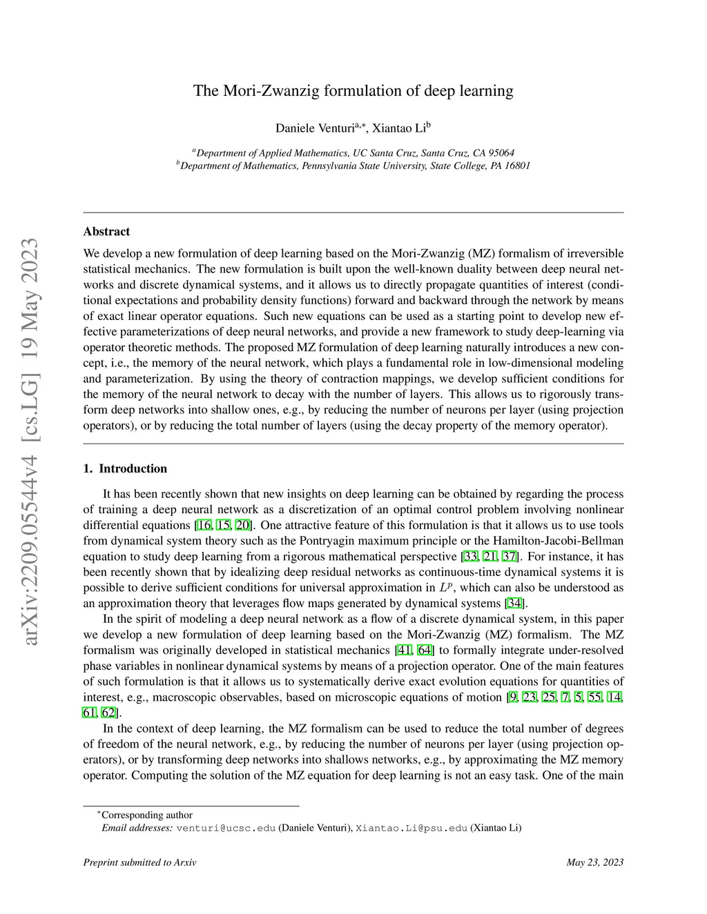 We develop a new formulation of deep learning based on the Mori-Zwanzig (MZ) formalism of irreversible statistical mechanics. The new formulation is built upon the well-known duality between deep neural networks and discrete dynamical systems, and it allows us to directly propagate quantities of interest (conditional expectations and probability density functions) forward and backward through the network by means of exact linear operator equations. Such new equations can be used as a starting point to develop new effective parameterizations of deep neural networks, and provide a new framework to study deep-learning via operator theoretic methods. The proposed MZ formulation of deep learning naturally introduces a new concept, i.e., the memory of the neural network, which plays a fundamental role in low-dimensional modeling and parameterization. By using the theory of contraction mappings, we develop sufficient conditions for the memory of the neural network to decay with the number of layers. This allows us to rigorously transform deep networks into shallow ones, e.g., by reducing the number of neurons per layer (using projection operators), or by reducing the total number of layers (using the decay property of the memory operator).