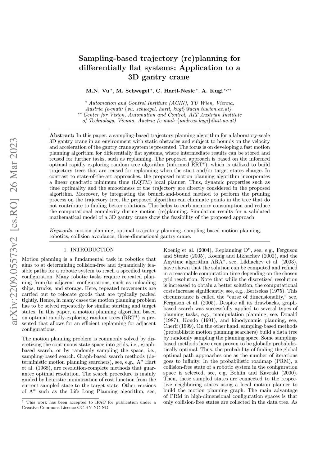 In this paper, a sampling-based trajectory planning algorithm for a laboratory-scale 3D gantry crane in an environment with static obstacles and subject to bounds on the velocity and acceleration of the gantry crane system is presented. The focus is on developing a fast motion planning algorithm for differentially flat systems, where intermediate results can be stored and reused for further tasks, such as replanning. The proposed approach is based on the informed optimal rapidly exploring random tree algorithm (informed RRT*), which is utilized to build trajectory trees that are reused for replanning when the start and/or target states change. In contrast to state-of-the-art approaches, the proposed motion planning algorithm incorporates a linear quadratic minimum time (LQTM) local planner. Thus, dynamic properties such as time optimality and the smoothness of the trajectory are directly considered in the proposed algorithm. Moreover, by integrating the branch-and-bound method to perform the pruning process on the trajectory tree, the proposed algorithm can eliminate points in the tree that do not contribute to finding better solutions. This helps to curb memory consumption and reduce the computational complexity during motion (re)planning. Simulation results for a validated mathematical model of a 3D gantry crane show the feasibility of the proposed approach.