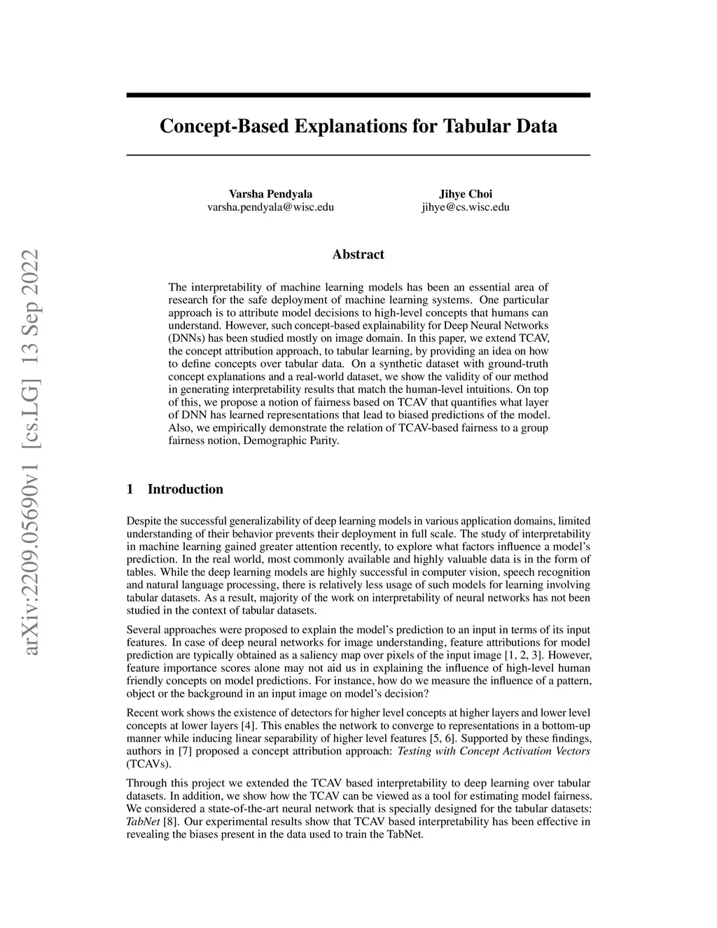The interpretability of machine learning models has been an essential area of research for the safe deployment of machine learning systems. One particular approach is to attribute model decisions to high-level concepts that humans can understand. However, such concept-based explainability for Deep Neural Networks (DNNs) has been studied mostly on image domain. In this paper, we extend TCAV, the concept attribution approach, to tabular learning, by providing an idea on how to define concepts over tabular data. On a synthetic dataset with ground-truth concept explanations and a real-world dataset, we show the validity of our method in generating interpretability results that match the human-level intuitions. On top of this, we propose a notion of fairness based on TCAV that quantifies what layer of DNN has learned representations that lead to biased predictions of the model. Also, we empirically demonstrate the relation of TCAV-based fairness to a group fairness notion, Demographic Parity.