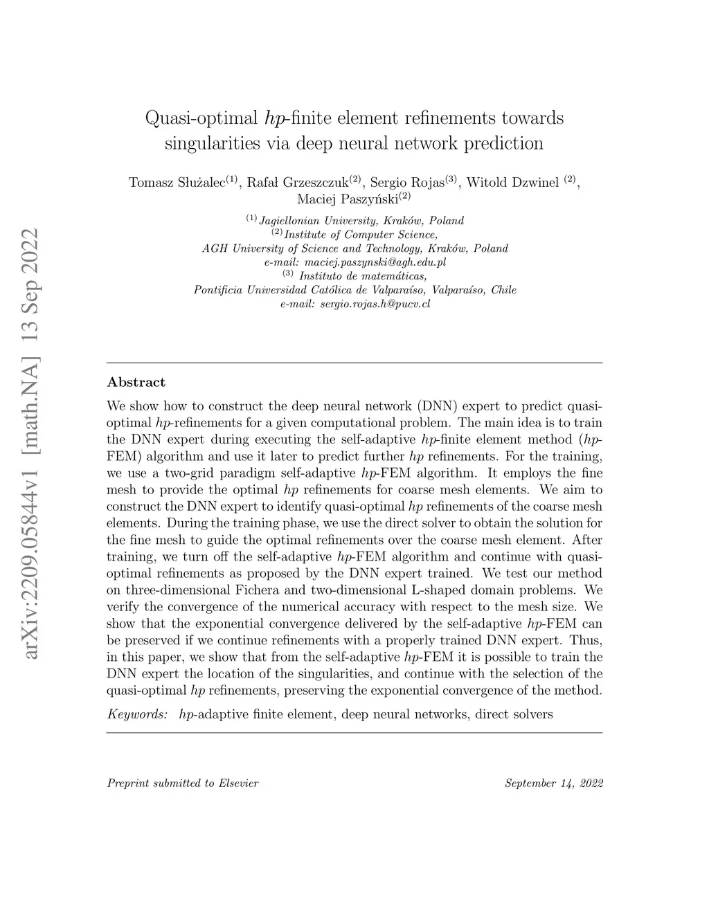 We show how to construct the deep neural network (DNN) expert to predict quasi-optimal -refinements for a given computational problem. The main idea is to train the DNN expert during executing the self-adaptive -finite element method (-FEM) algorithm and use it later to predict further refinements. For the training, we use a two-grid paradigm self-adaptive -FEM algorithm. It employs the fine mesh to provide the optimal refinements for coarse mesh elements. We aim to construct the DNN expert to identify quasi-optimal refinements of the coarse mesh elements. During the training phase, we use the direct solver to obtain the solution for the fine mesh to guide the optimal refinements over the coarse mesh element. After training, we turn off the self-adaptive -FEM algorithm and continue with quasi-optimal refinements as proposed by the DNN expert trained. We test our method on three-dimensional Fichera and two-dimensional L-shaped domain problems. We verify the convergence of the numerical accuracy with respect to the mesh size. We show that the exponential convergence delivered by the self-adaptive -FEM can be preserved if we continue refinements with a properly trained DNN expert. Thus, in this paper, we show that from the self-adaptive -FEM it is possible to train the DNN expert the location of the singularities, and continue with the selection of the quasi-optimal refinements, preserving the exponential convergence of the method.