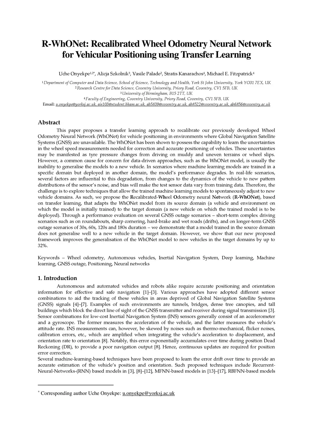 This paper proposes a transfer learning approach to recalibrate our previously developed Wheel Odometry Neural Network (WhONet) for vehicle positioning in environments where Global Navigation Satellite Systems (GNSS) are unavailable. The WhONet has been shown to possess the capability to learn the uncertainties in the wheel speed measurements needed for correction and accurate positioning of vehicles. These uncertainties may be manifested as tyre pressure changes from driving on muddy and uneven terrains or wheel slips. However, a common cause for concern for data-driven approaches, such as the WhONet model, is usually the inability to generalise the models to a new vehicle. In scenarios where machine learning models are trained in a specific domain but deployed in another domain, the model's performance degrades. In real-life scenarios, several factors are influential to this degradation, from changes to the dynamics of the vehicle to new pattern distributions of the sensor's noise, and bias will make the test sensor data vary from training data. Therefore, the challenge is to explore techniques that allow the trained machine learning models to spontaneously adjust to new vehicle domains. As such, we propose the Recalibrated-Wheel Odometry neural Network (R-WhONet), that adapts the WhONet model from its source domain (a vehicle and environment on which the model is initially trained) to the target domain (a new vehicle on which the trained model is to be deployed). Through a performance evaluation on several GNSS outage scenarios - short-term complex driving scenarios, and on longer-term GNSS outage scenarios. We demonstrate that a model trained in the source domain does not generalise well to a new vehicle in the target domain. However, we show that our new proposed framework improves the generalisation of the WhONet model to new vehicles in the target domains by up to 32%.