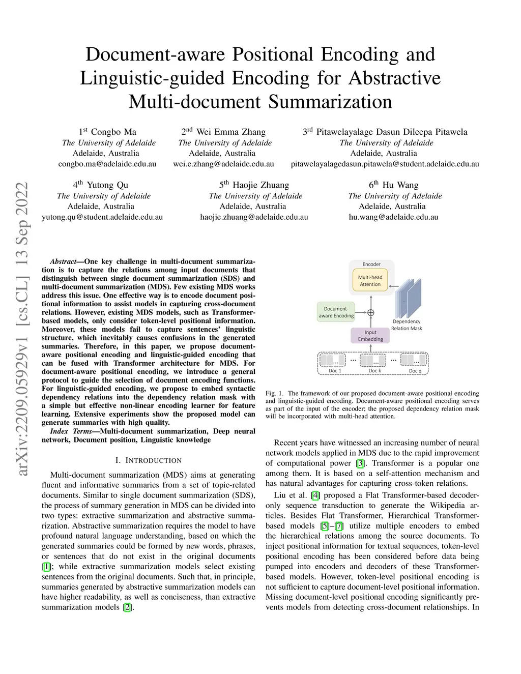 One key challenge in multi-document summarization is to capture the relations among input documents that distinguish between single document summarization (SDS) and multi-document summarization (MDS). Few existing MDS works address this issue. One effective way is to encode document positional information to assist models in capturing cross-document relations. However, existing MDS models, such as Transformer-based models, only consider token-level positional information. Moreover, these models fail to capture sentences' linguistic structure, which inevitably causes confusions in the generated summaries. Therefore, in this paper, we propose document-aware positional encoding and linguistic-guided encoding that can be fused with Transformer architecture for MDS. For document-aware positional encoding, we introduce a general protocol to guide the selection of document encoding functions. For linguistic-guided encoding, we propose to embed syntactic dependency relations into the dependency relation mask with a simple but effective non-linear encoding learner for feature learning. Extensive experiments show the proposed model can generate summaries with high quality.