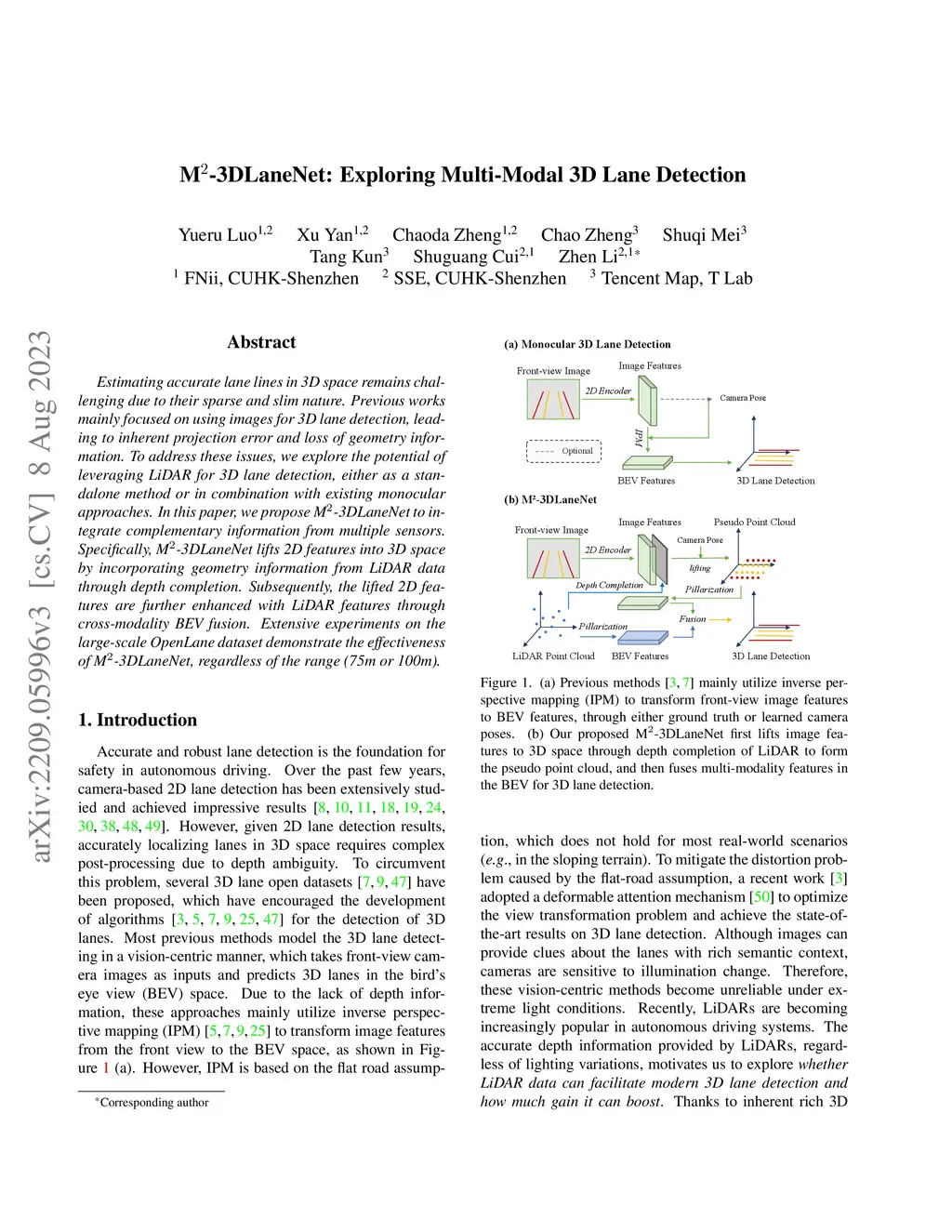 Estimating accurate lane lines in 3D space remains challenging due to their sparse and slim nature. Previous works mainly focused on using images for 3D lane detection, leading to inherent projection error and loss of geometry information. To address these issues, we explore the potential of leveraging LiDAR for 3D lane detection, either as a standalone method or in combination with existing monocular approaches. In this paper, we propose M-3DLaneNet to integrate complementary information from multiple sensors. Specifically, M-3DLaneNet lifts 2D features into 3D space by incorporating geometry information from LiDAR data through depth completion. Subsequently, the lifted 2D features are further enhanced with LiDAR features through cross-modality BEV fusion. Extensive experiments on the large-scale OpenLane dataset demonstrate the effectiveness of M-3DLaneNet, regardless of the range (75m or 100m).