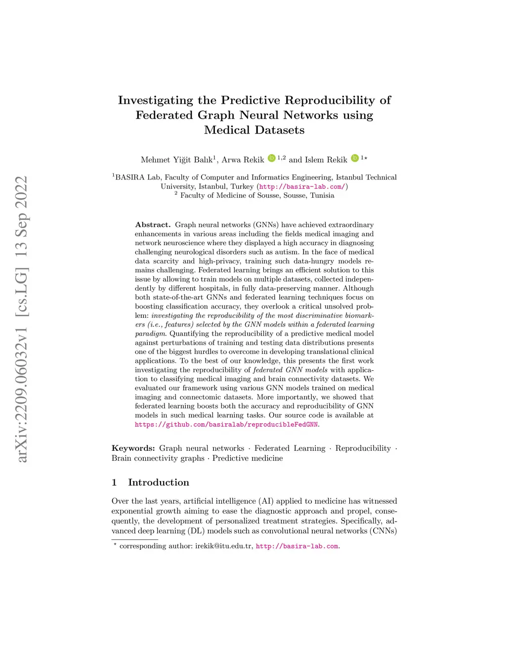 Graph neural networks (GNNs) have achieved extraordinary enhancements in various areas including the fields medical imaging and network neuroscience where they displayed a high accuracy in diagnosing challenging neurological disorders such as autism. In the face of medical data scarcity and high-privacy, training such data-hungry models remains challenging. Federated learning brings an efficient solution to this issue by allowing to train models on multiple datasets, collected independently by different hospitals, in fully data-preserving manner. Although both state-of-the-art GNNs and federated learning techniques focus on boosting classification accuracy, they overlook a critical unsolved problem: investigating the reproducibility of the most discriminative biomarkers (i.e., features) selected by the GNN models within a federated learning paradigm. Quantifying the reproducibility of a predictive medical model against perturbations of training and testing data distributions presents one of the biggest hurdles to overcome in developing translational clinical applications. To the best of our knowledge, this presents the first work investigating the reproducibility of federated GNN models with application to classifying medical imaging and brain connectivity datasets. We evaluated our framework using various GNN models trained on medical imaging and connectomic datasets. More importantly, we showed that federated learning boosts both the accuracy and reproducibility of GNN models in such medical learning tasks. Our source code is available at https://github.com/basiralab/reproducibleFedGNN.