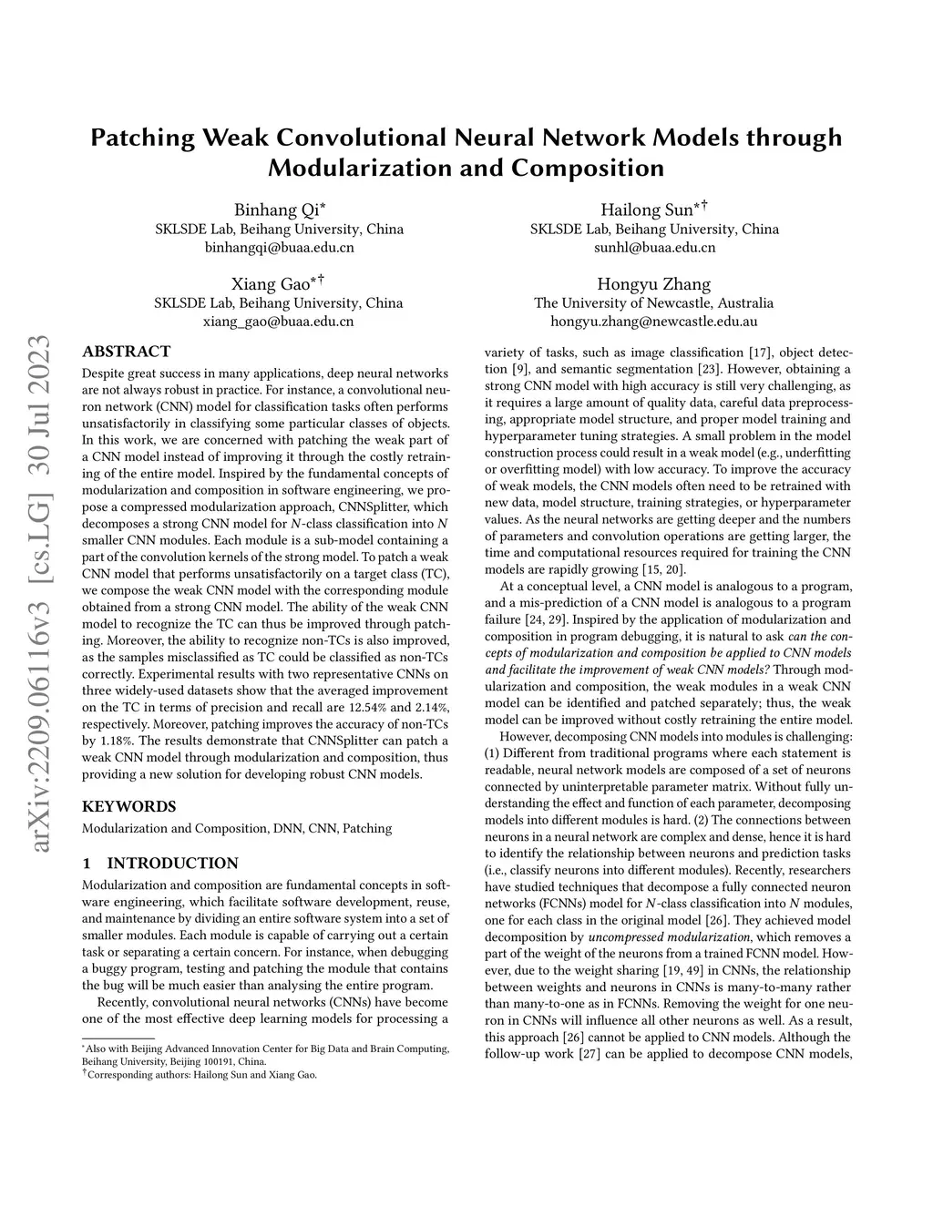 Despite great success in many applications, deep neural networks are not always robust in practice. For instance, a convolutional neuron network (CNN) model for classification tasks often performs unsatisfactorily in classifying some particular classes of objects. In this work, we are concerned with patching the weak part of a CNN model instead of improving it through the costly retraining of the entire model. Inspired by the fundamental concepts of modularization and composition in software engineering, we propose a compressed modularization approach, CNNSplitter, which decomposes a strong CNN model for -class classification into smaller CNN modules. Each module is a sub-model containing a part of the convolution kernels of the strong model. To patch a weak CNN model that performs unsatisfactorily on a target class (TC), we compose the weak CNN model with the corresponding module obtained from a strong CNN model. The ability of the weak CNN model to recognize the TC can thus be improved through patching. Moreover, the ability to recognize non-TCs is also improved, as the samples misclassified as TC could be classified as non-TCs correctly. Experimental results with two representative CNNs on three widely-used datasets show that the averaged improvement on the TC in terms of precision and recall are 12.54% and 2.14%, respectively. Moreover, patching improves the accuracy of non-TCs by 1.18%. The results demonstrate that CNNSplitter can patch a weak CNN model through modularization and composition, thus providing a new solution for developing robust CNN models.