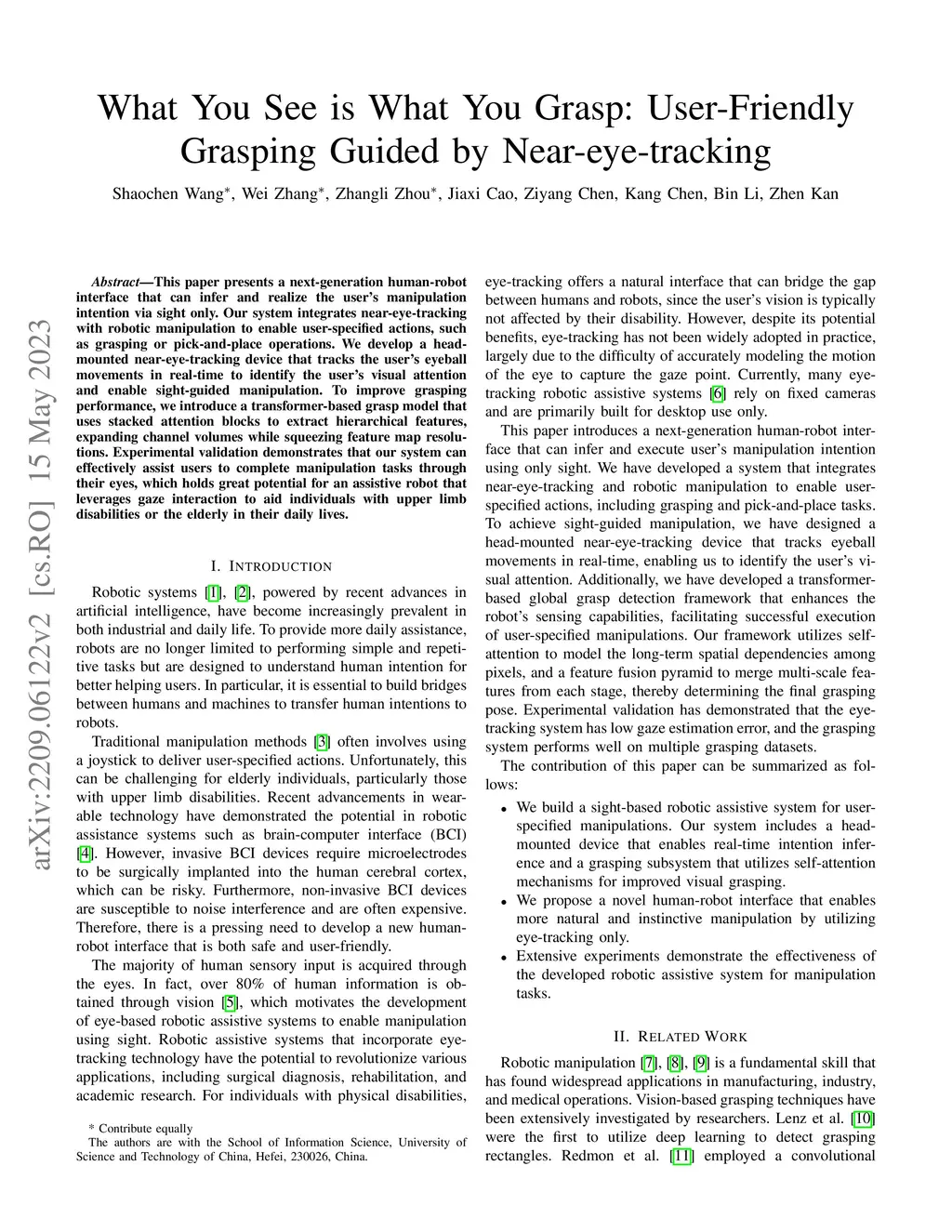 This work presents a next-generation human-robot interface that can infer and realize the user's manipulation intention via sight only. Specifically, we develop a system that integrates near-eye-tracking and robotic manipulation to enable user-specified actions (e.g., grasp, pick-and-place, etc), where visual information is merged with human attention to create a mapping for desired robot actions. To enable sight guided manipulation, a head-mounted near-eye-tracking device is developed to track the eyeball movements in real-time, so that the user's visual attention can be identified. To improve the grasping performance, a transformer based grasp model is then developed. Stacked transformer blocks are used to extract hierarchical features where the volumes of channels are expanded at each stage while squeezing the resolution of feature maps. Experimental validation demonstrates that the eye-tracking system yields low gaze estimation error and the grasping system yields promising results on multiple grasping datasets. This work is a proof of concept for gaze interaction-based assistive robot, which holds great promise to help the elder or upper limb disabilities in their daily lives. A demo video is available at https://www.youtube.com/watch?v=yuZ1hukYUrM